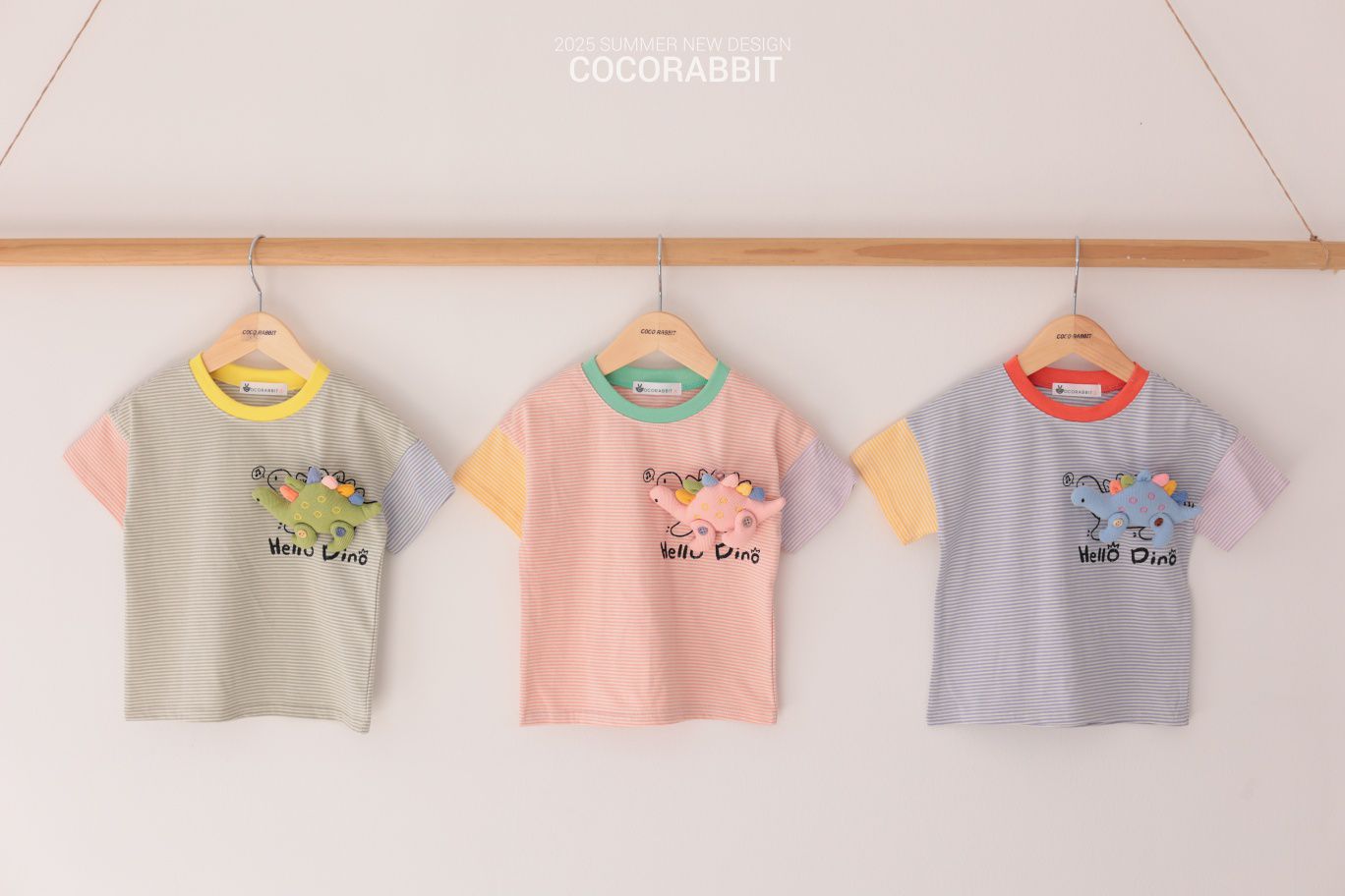 韓國 Coco Rabbit - (附恐龍裝飾)撞色細條紋短袖上衣-綠