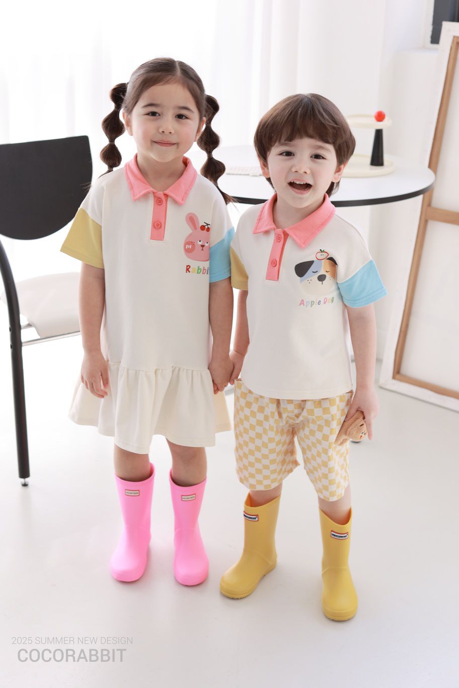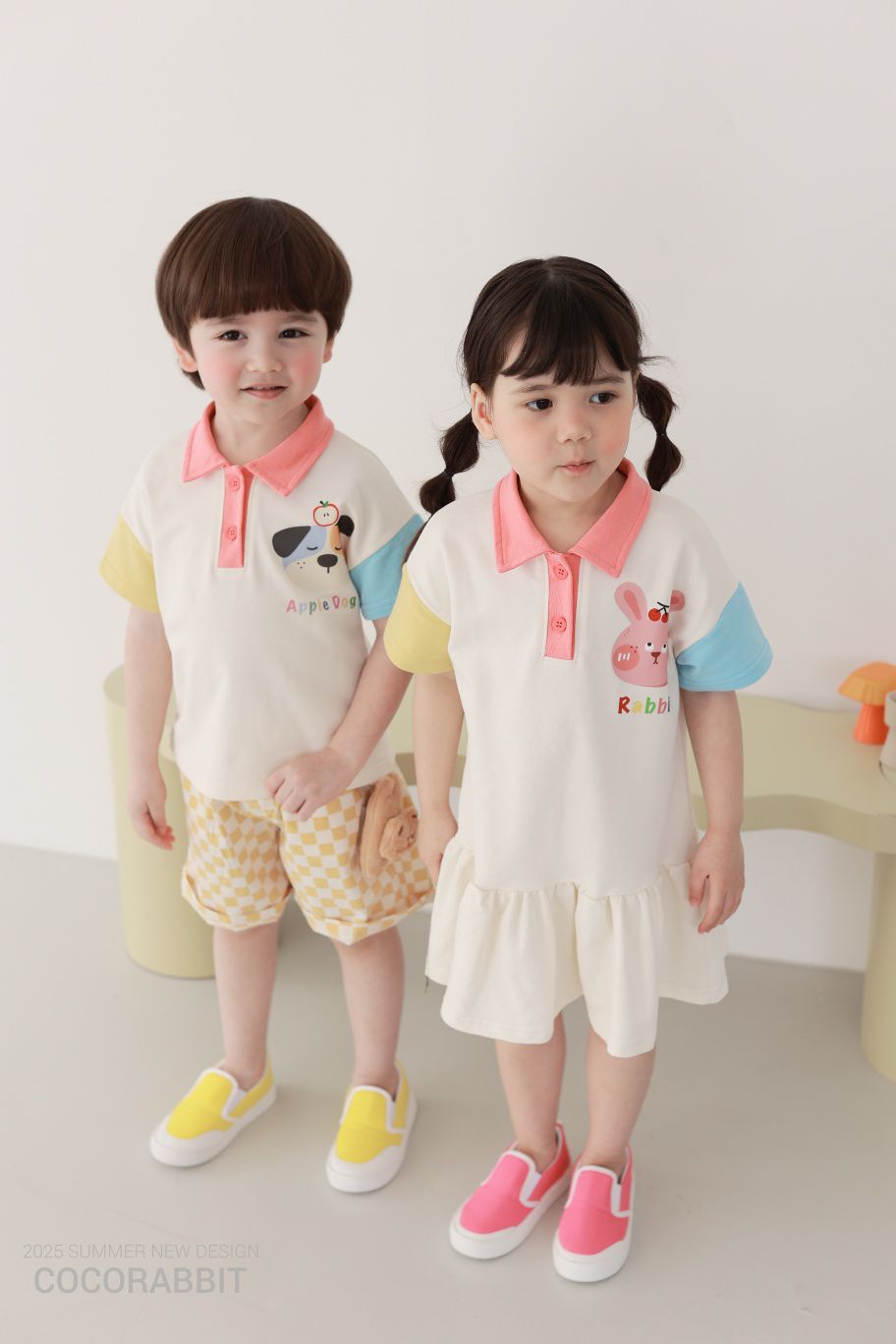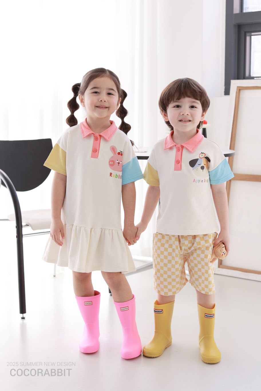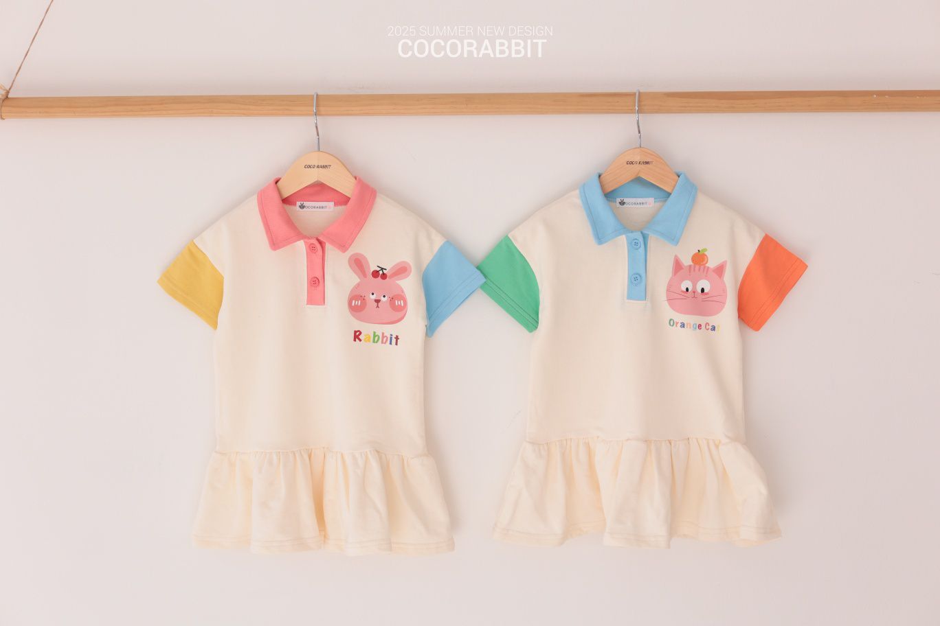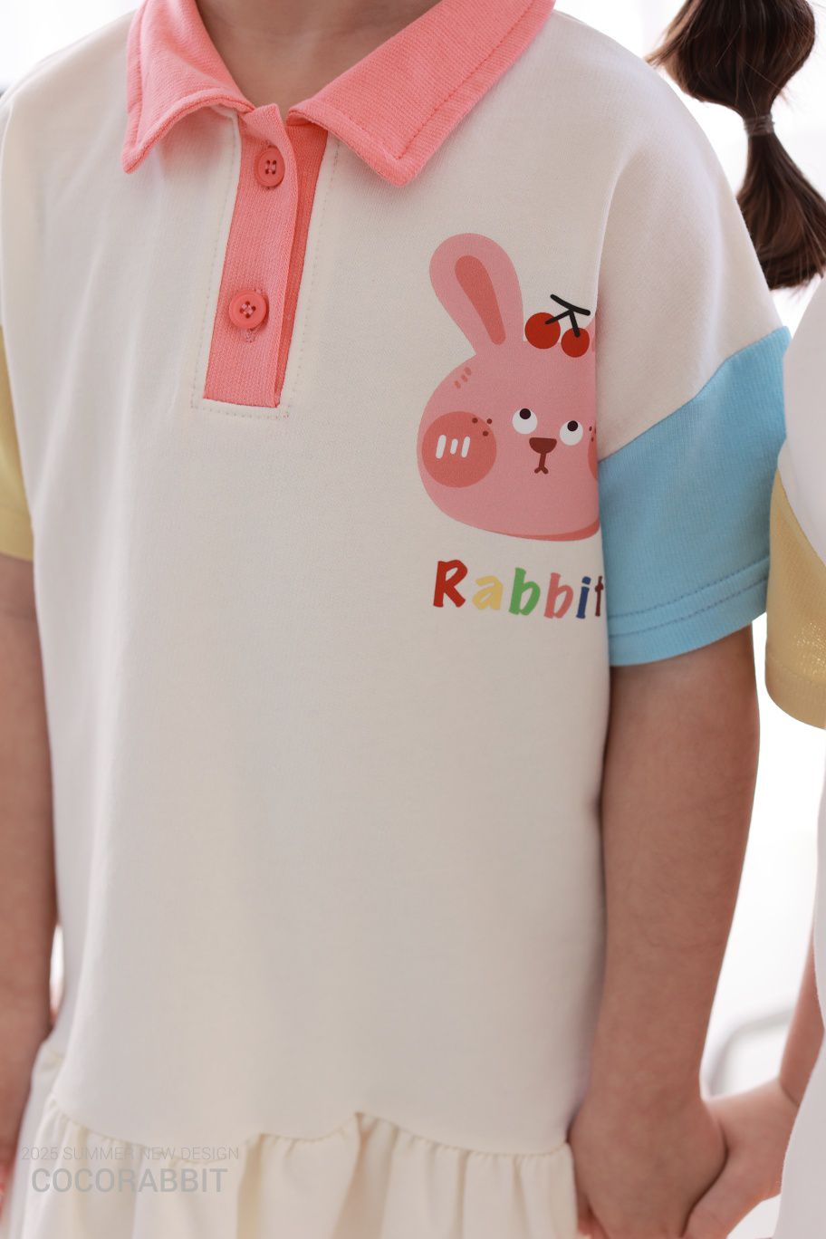 韓國 Coco Rabbit - 撞色翻領短袖荷葉襬拼接洋裝-櫻桃兔-黃X藍
