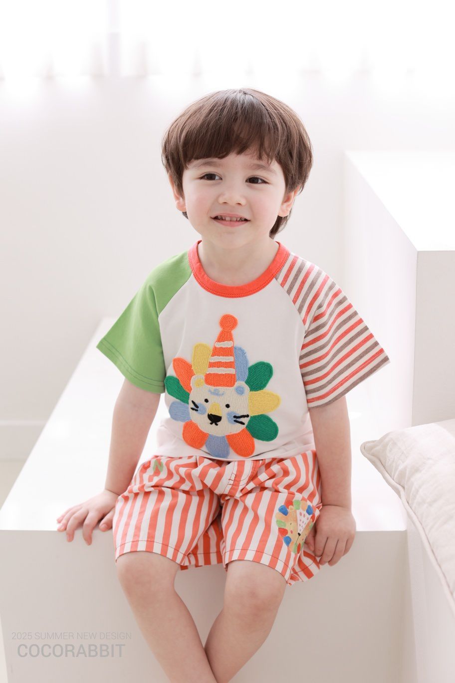 韓國 Coco Rabbit - 鬆緊腰水彩獅子直紋短褲-橘紅