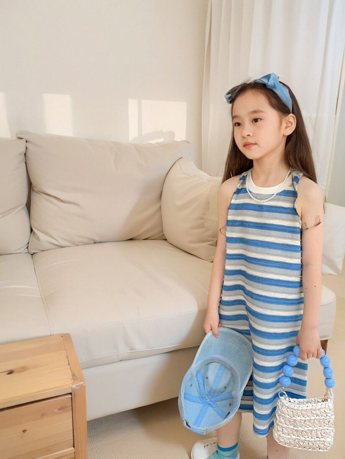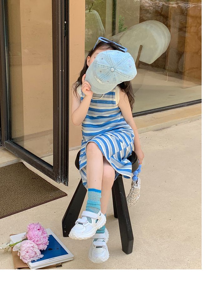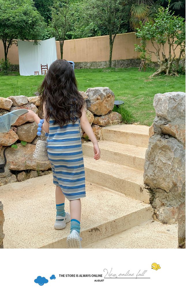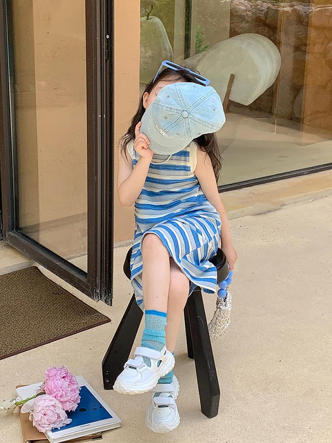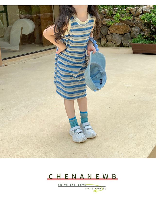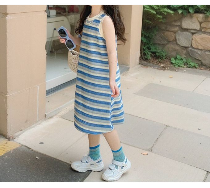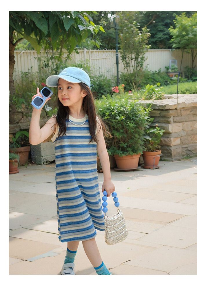 純棉休閒圓領無袖洋裝-條紋-藍色
