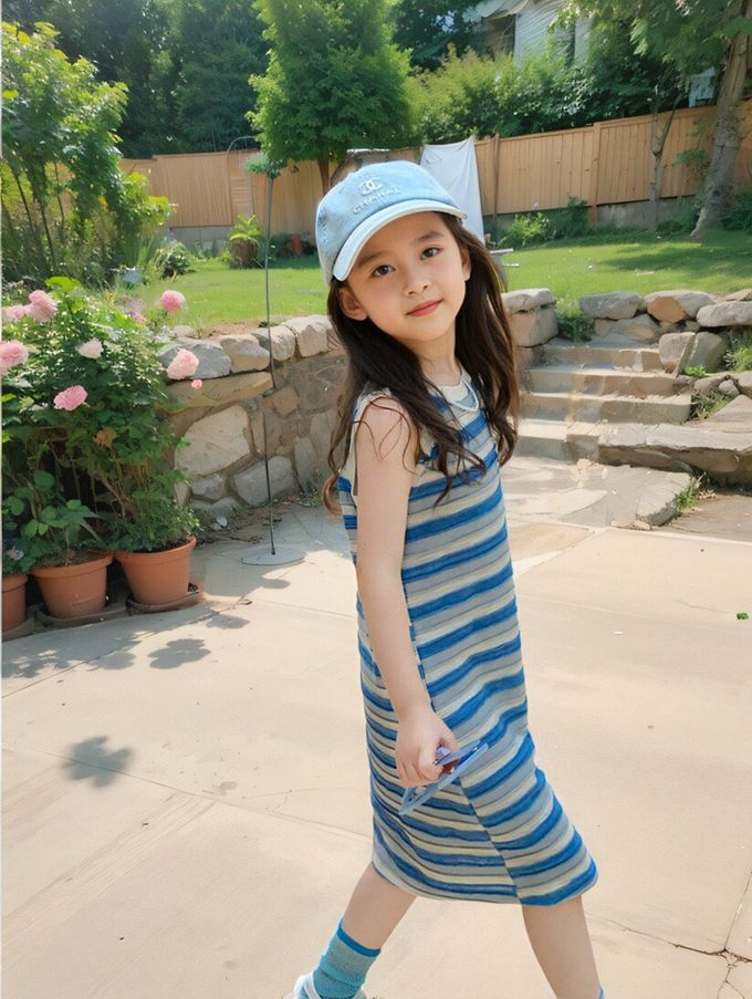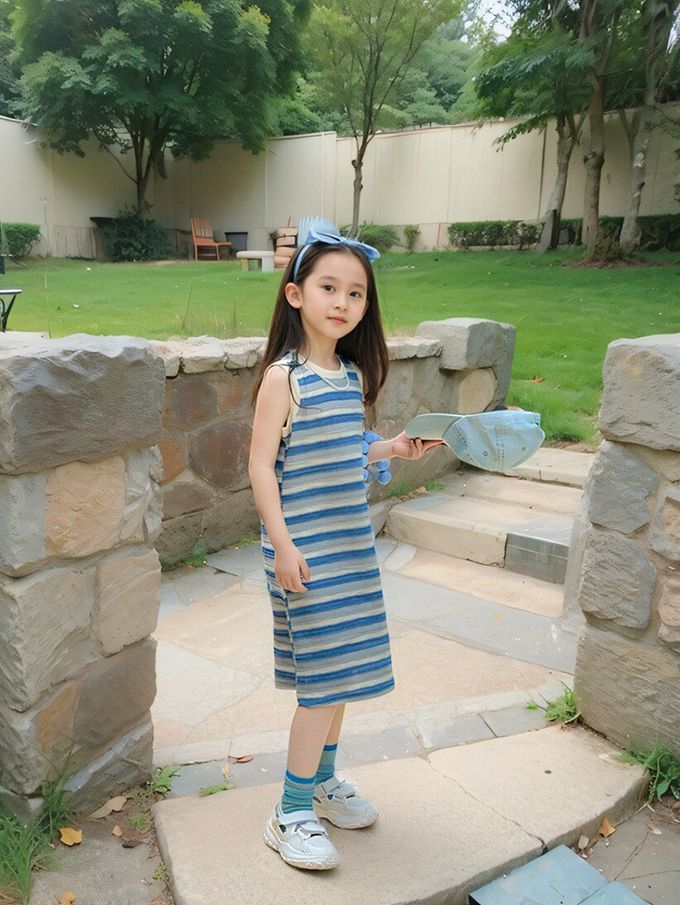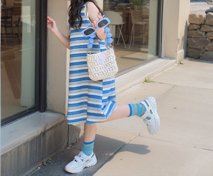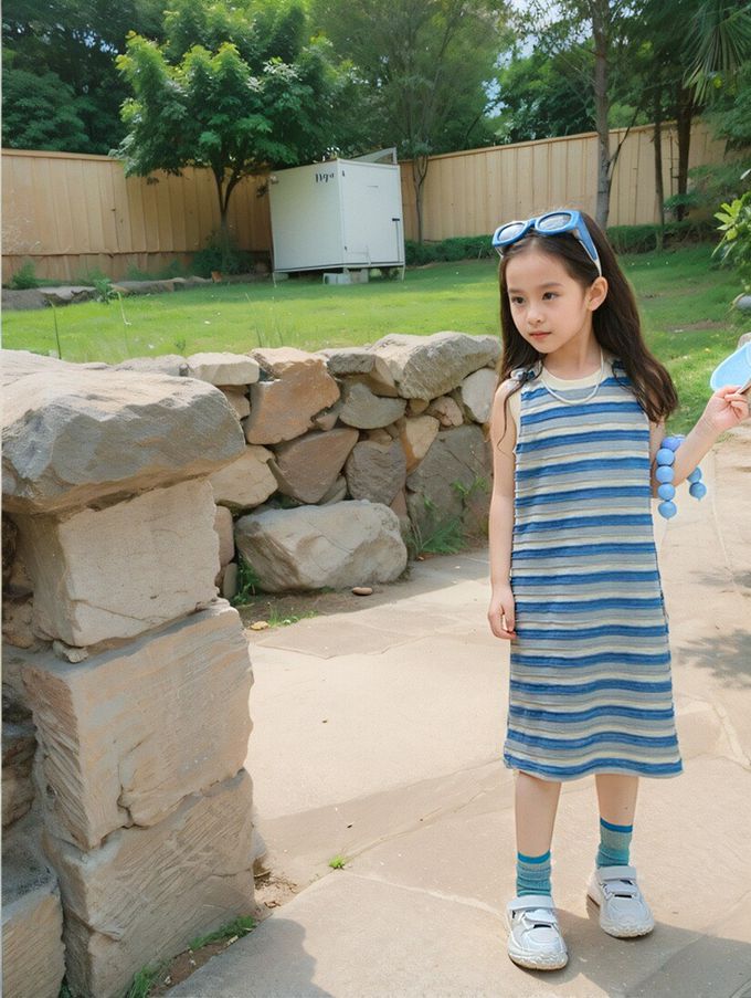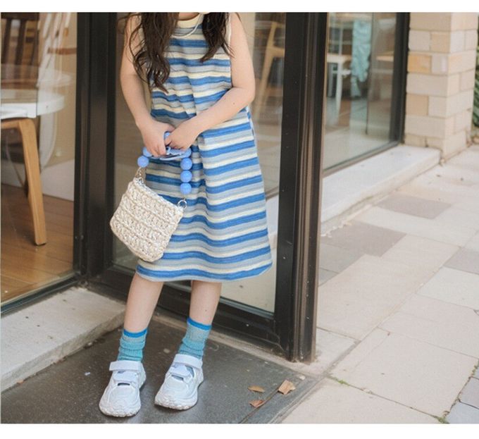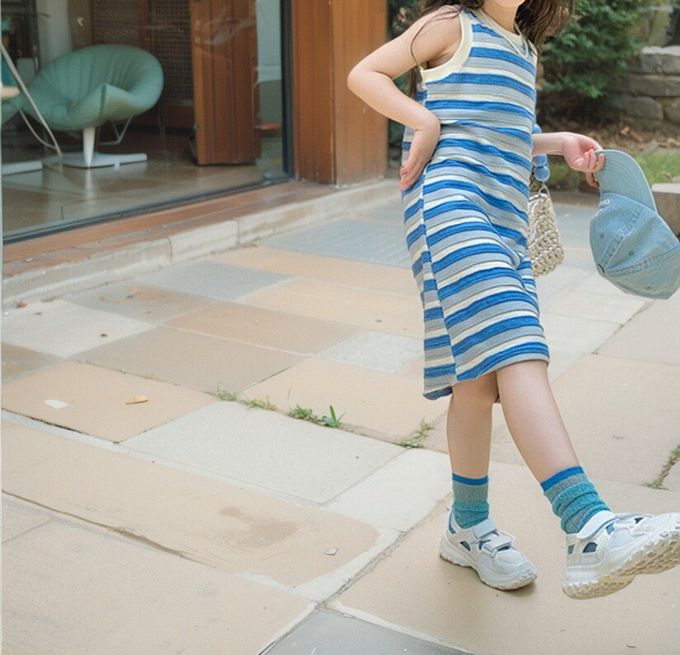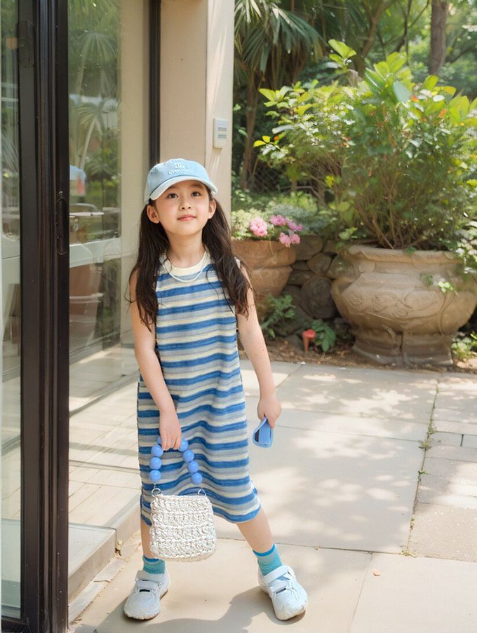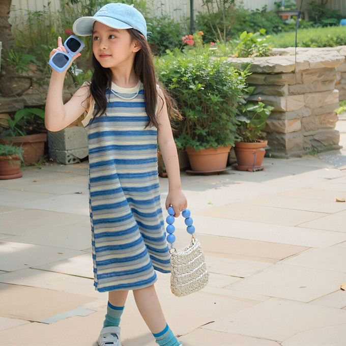 純棉休閒圓領無袖洋裝-條紋-藍色