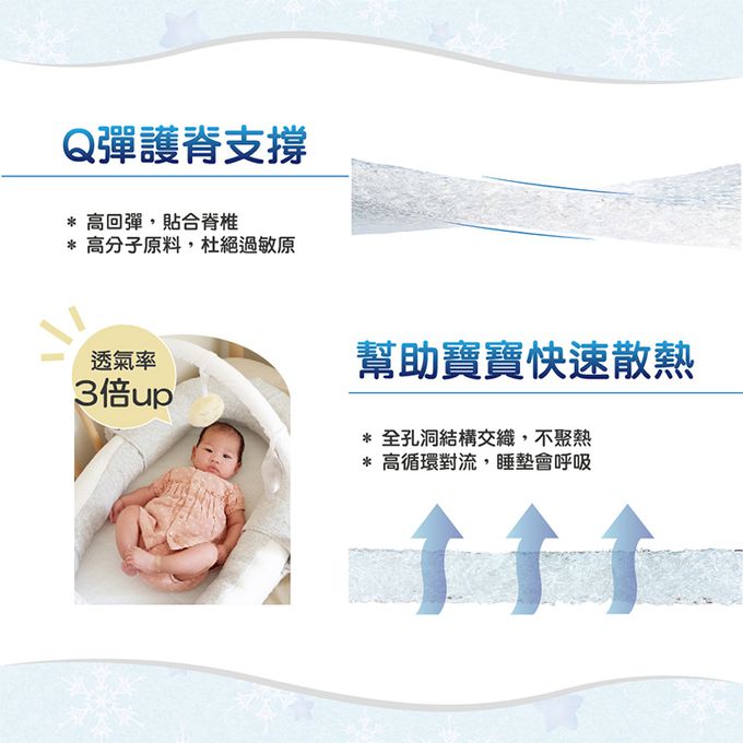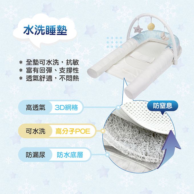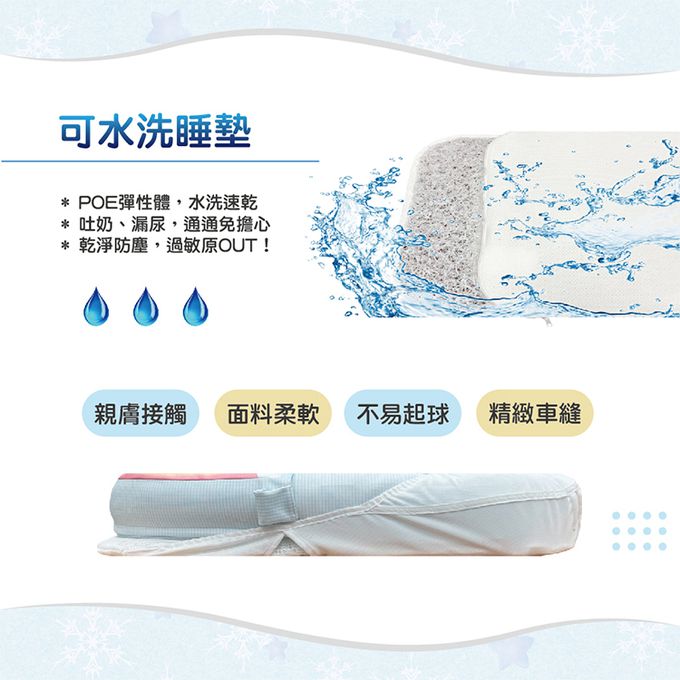 有助於良好的空氣流通,降低窒息風險,可水洗睡墊方便清潔。