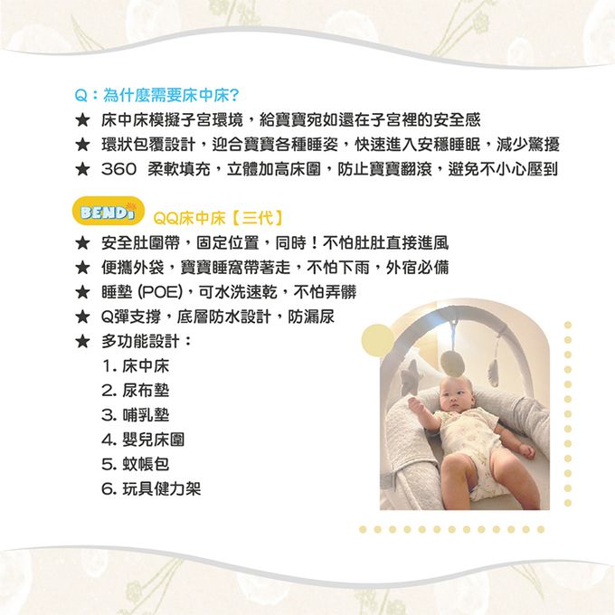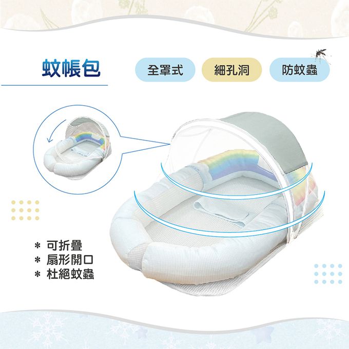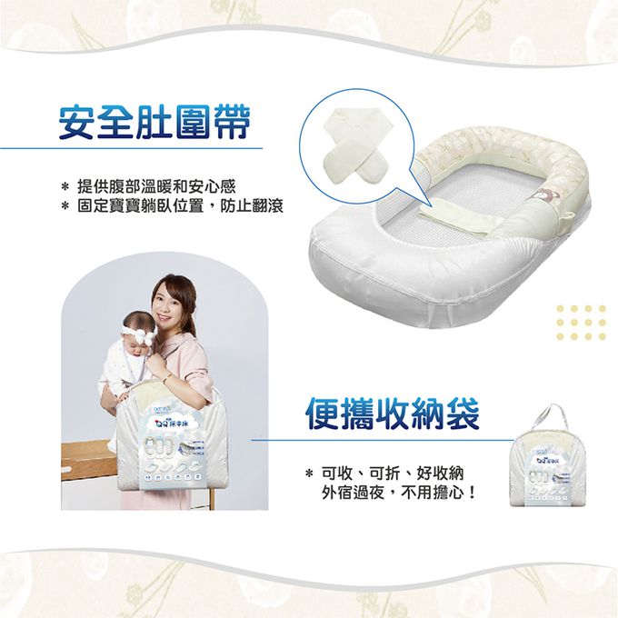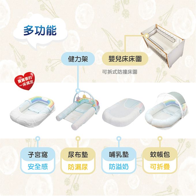 內容物:嬰兒床圍、可水洗睡墊、安全肚圍帶、蚊帳包、玩具健力架、收納袋