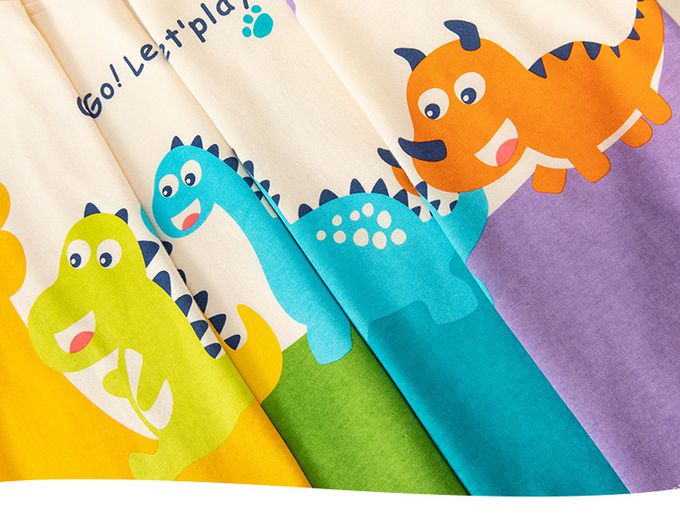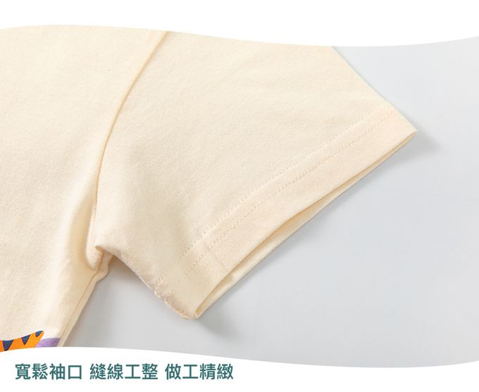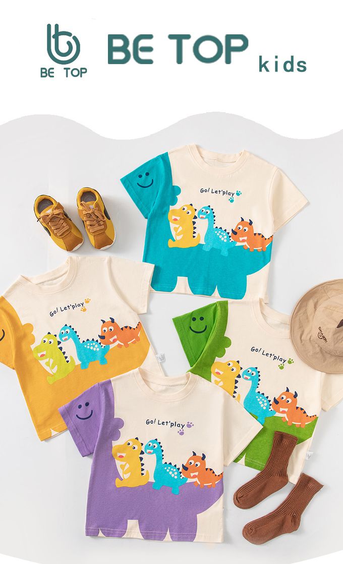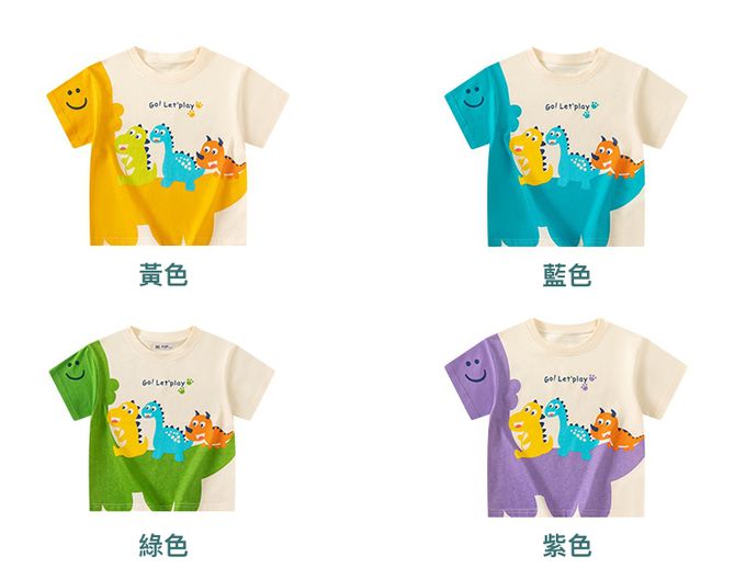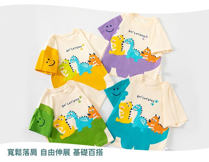 BE TOP - 純棉短袖上衣-可愛恐龍-黃藍拼袖