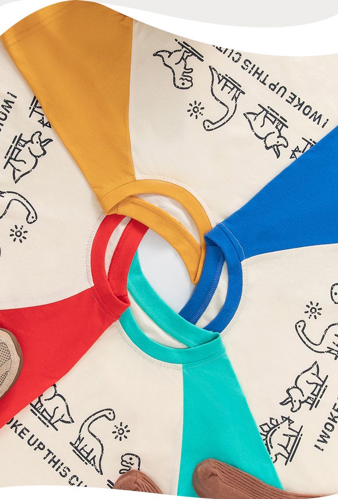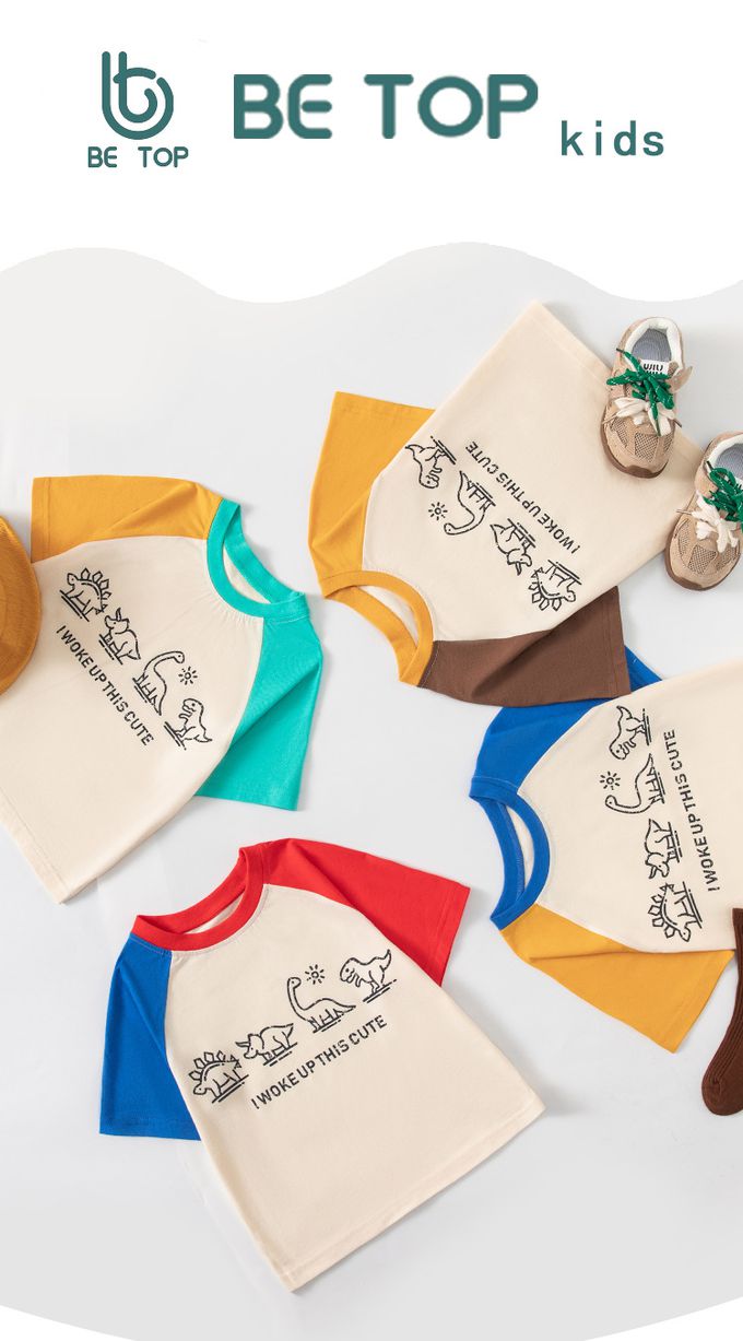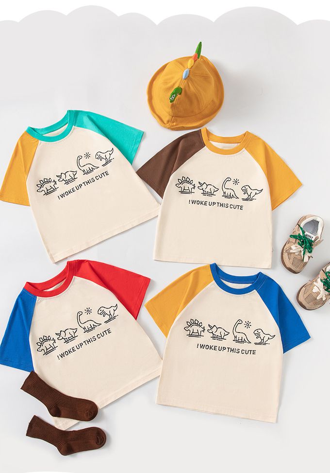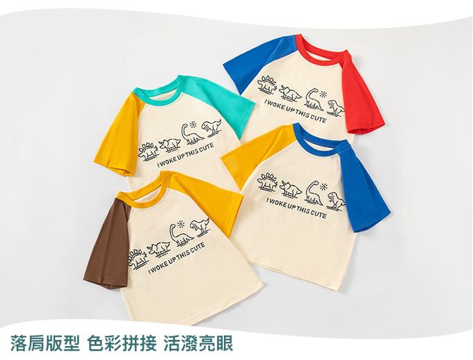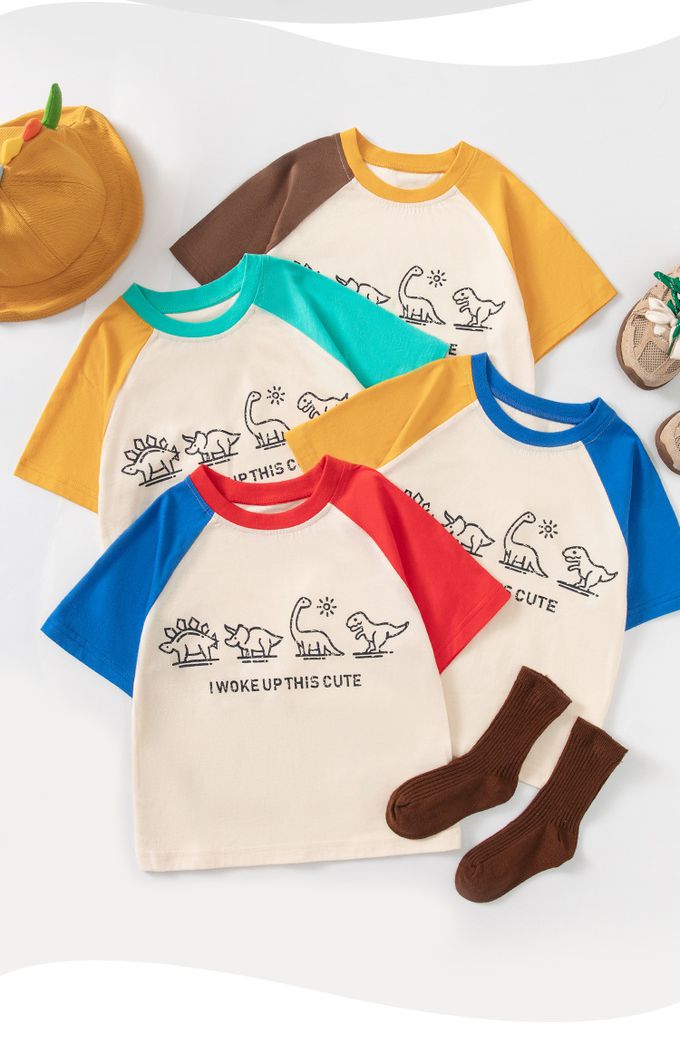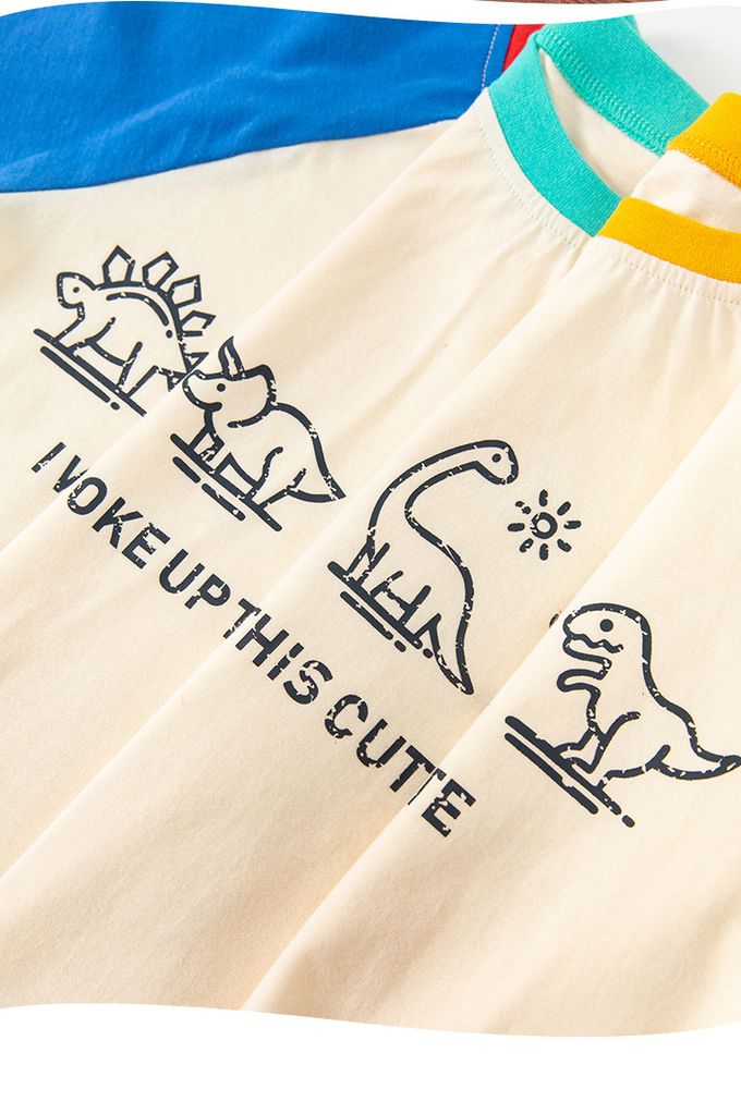 BE TOP - 純棉短袖上衣-可愛恐龍-黃藍拼袖