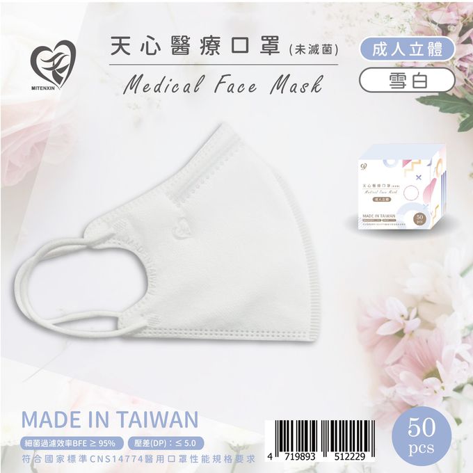 天心 - 成人3D立體醫療口罩 50入-雪白