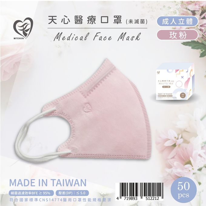 天心 - 成人3D立體醫療口罩 50入-玫粉