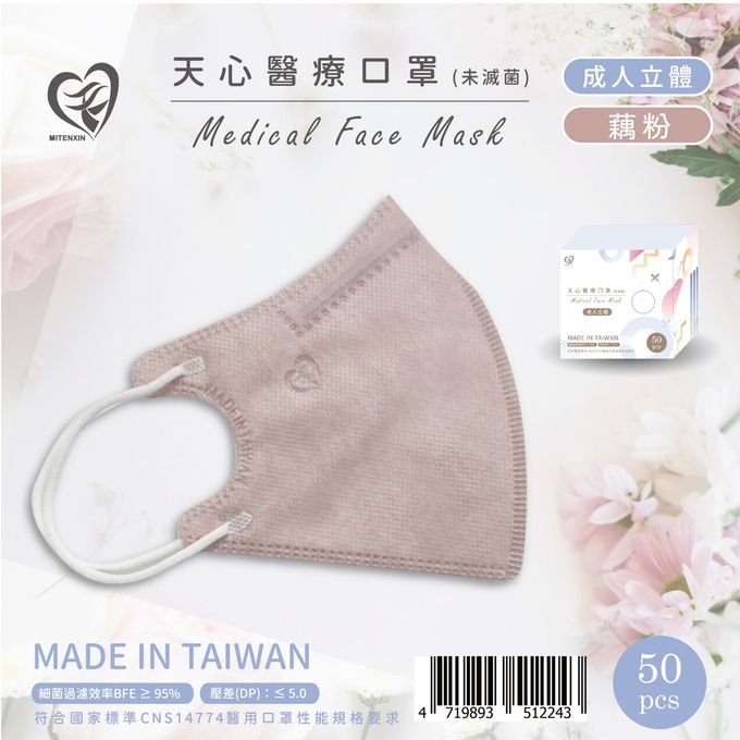 天心 - 成人3D立體醫療口罩 50入-藕粉