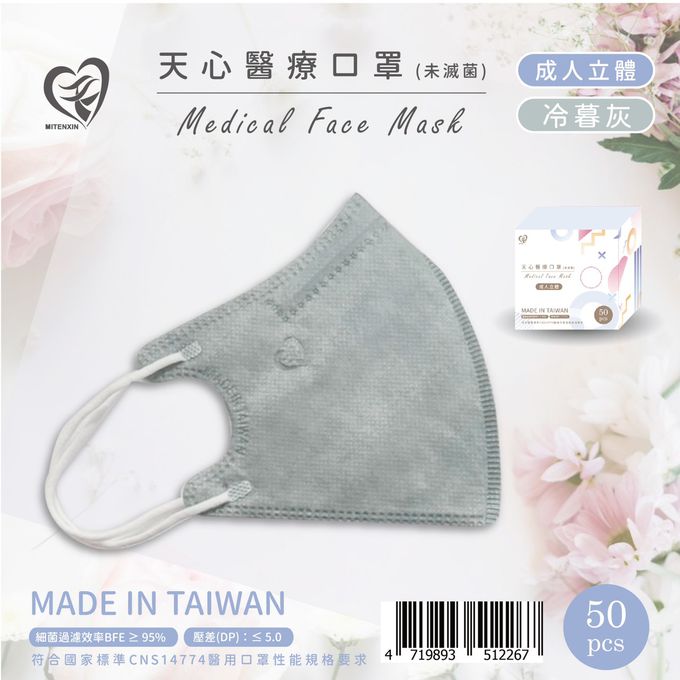 天心 - 成人3D立體醫療口罩 50入-冷暮灰