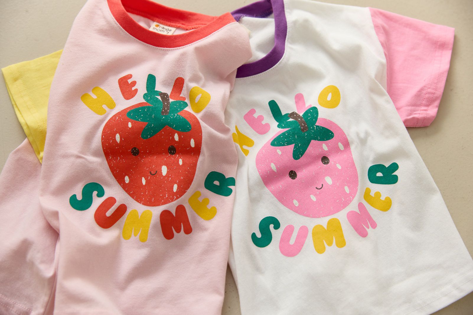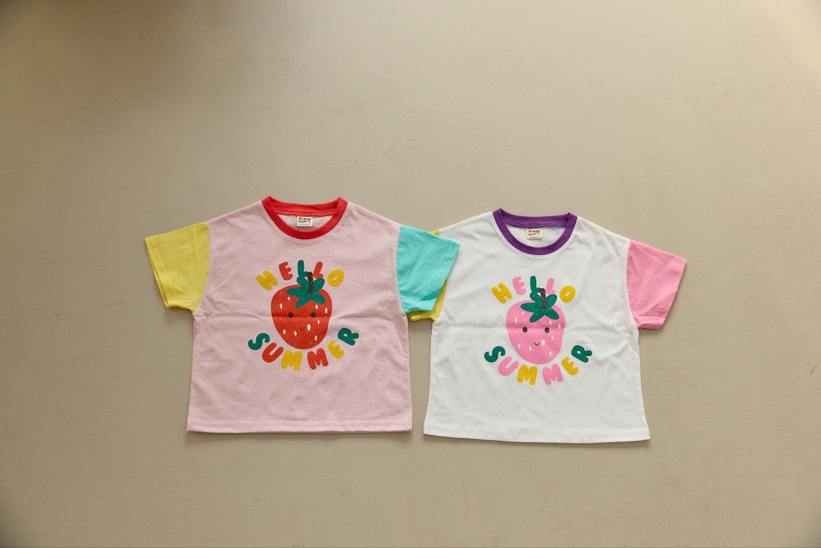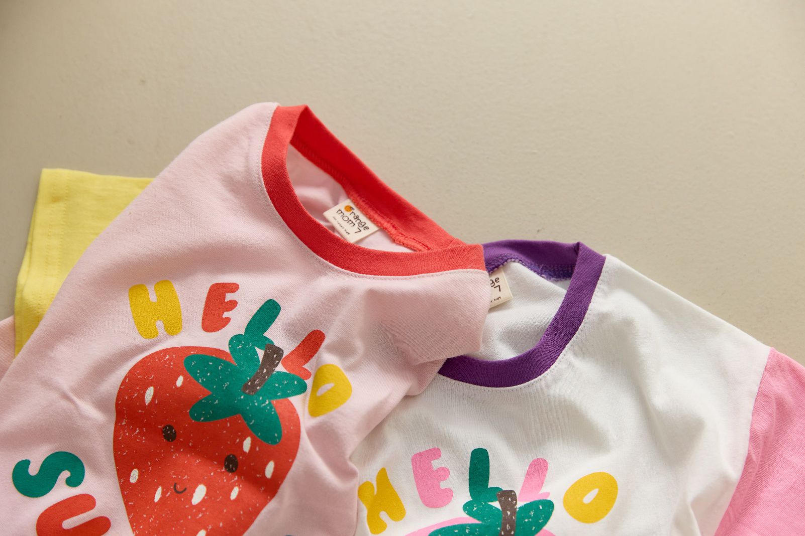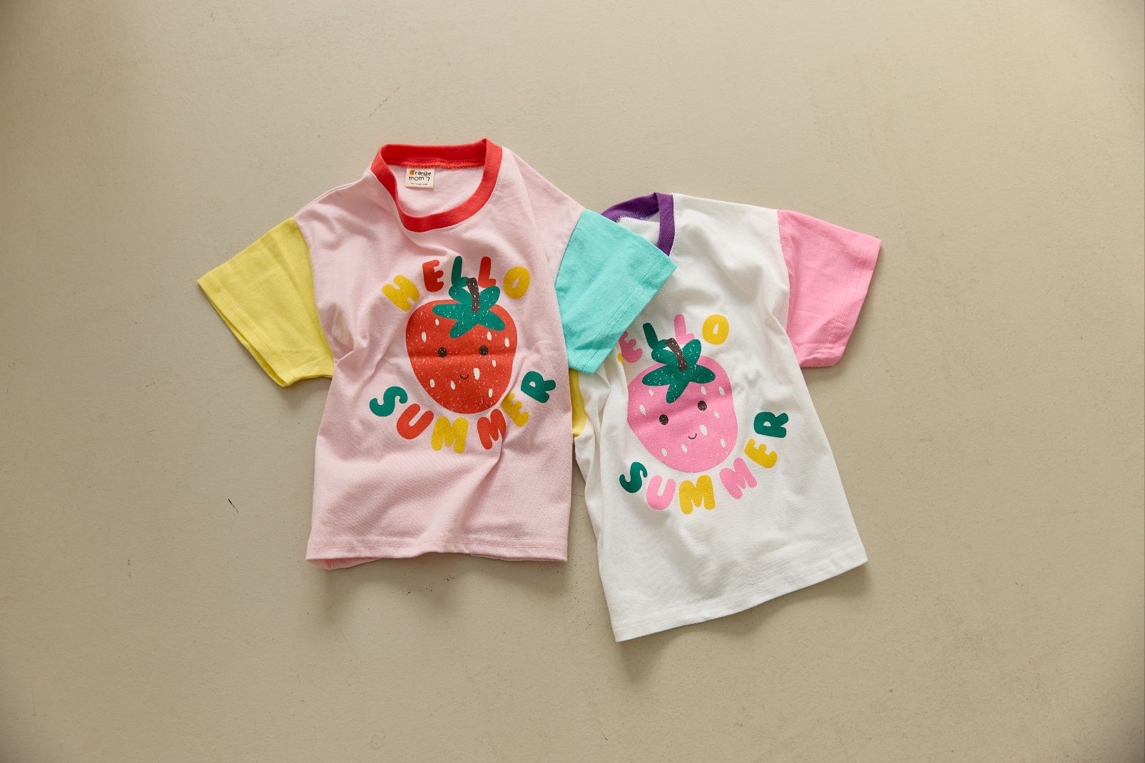 韓國 Orange Mom - 哈囉草莓季拼色短袖上衣-黃X米白X粉