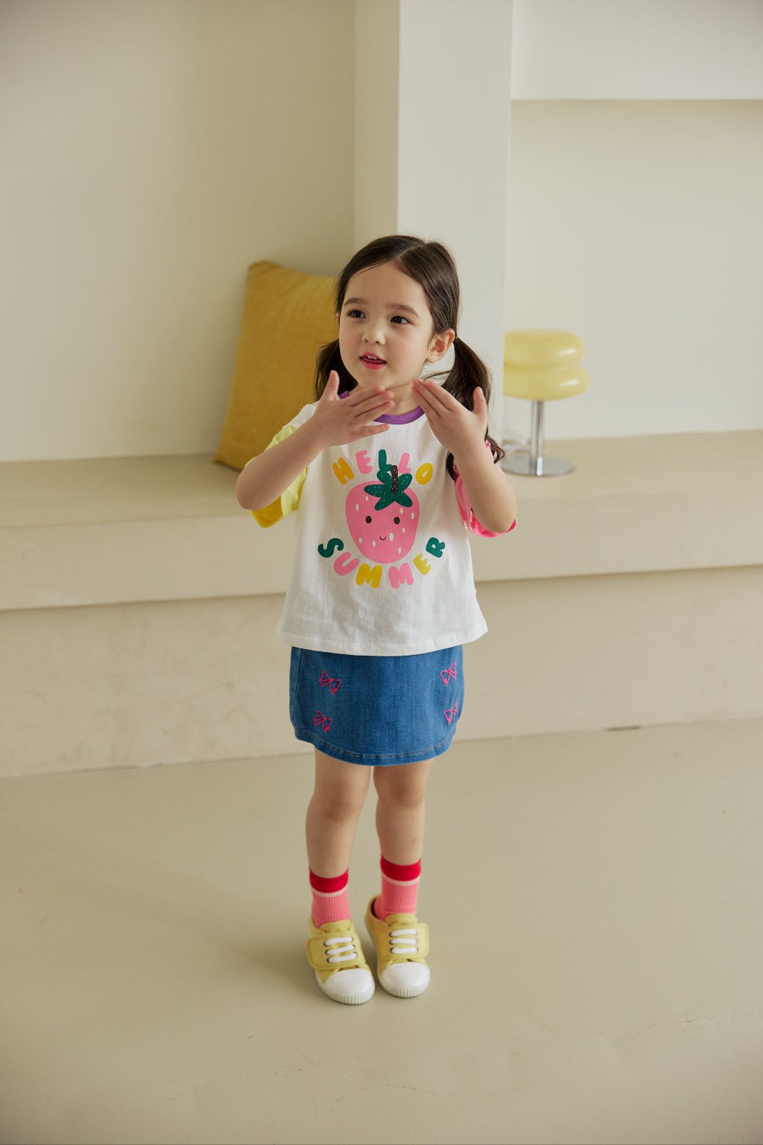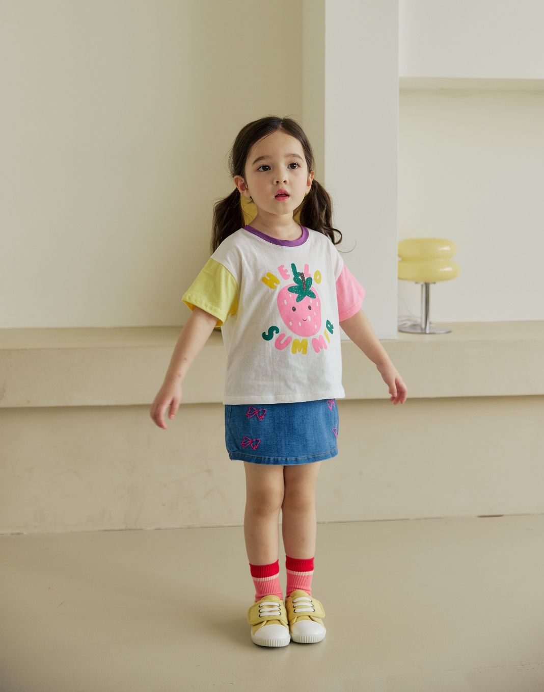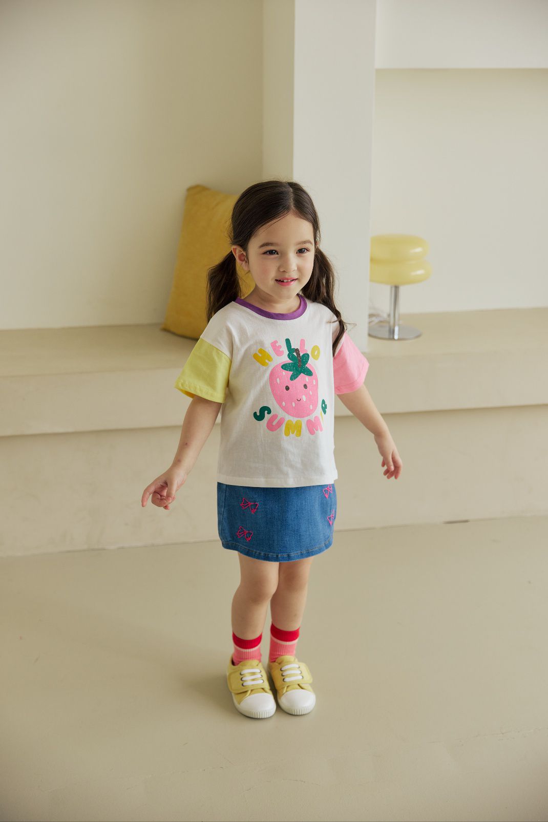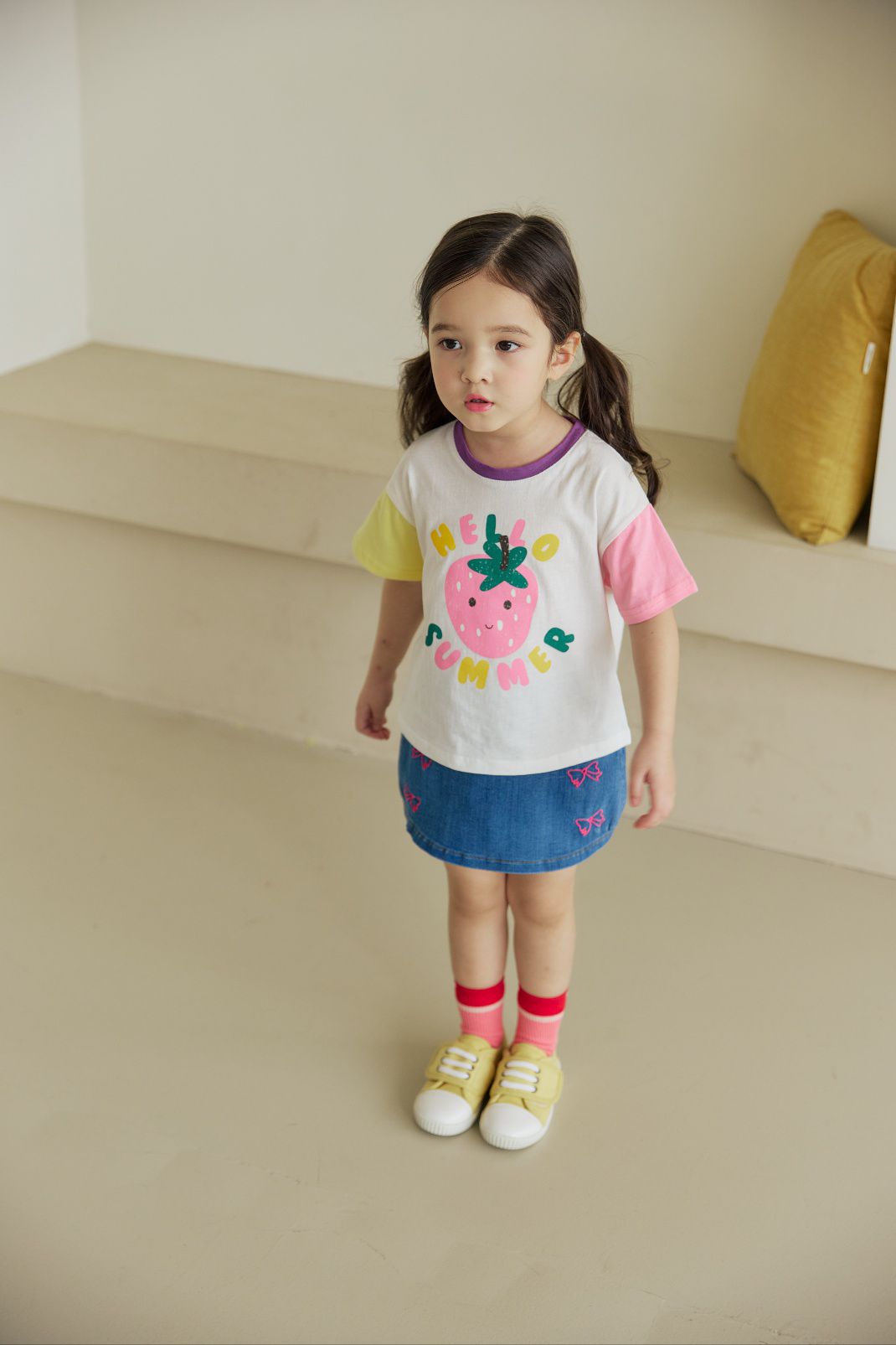 韓國 Orange Mom - 哈囉草莓季拼色短袖上衣-黃X米白X粉