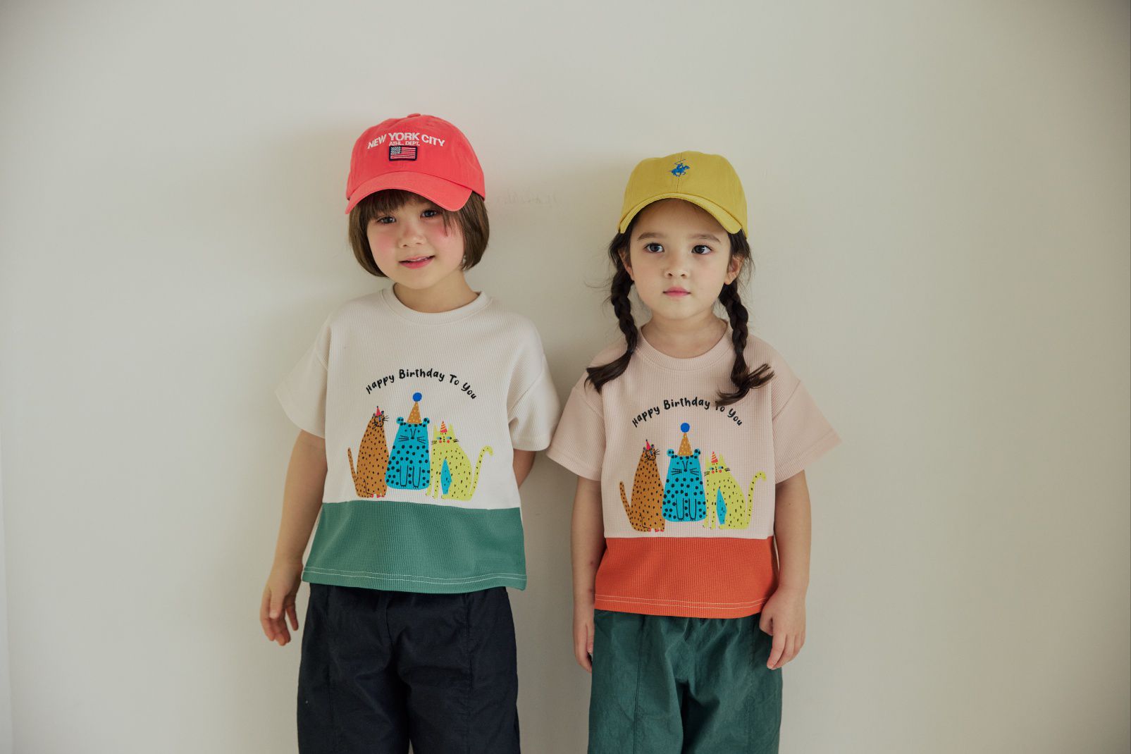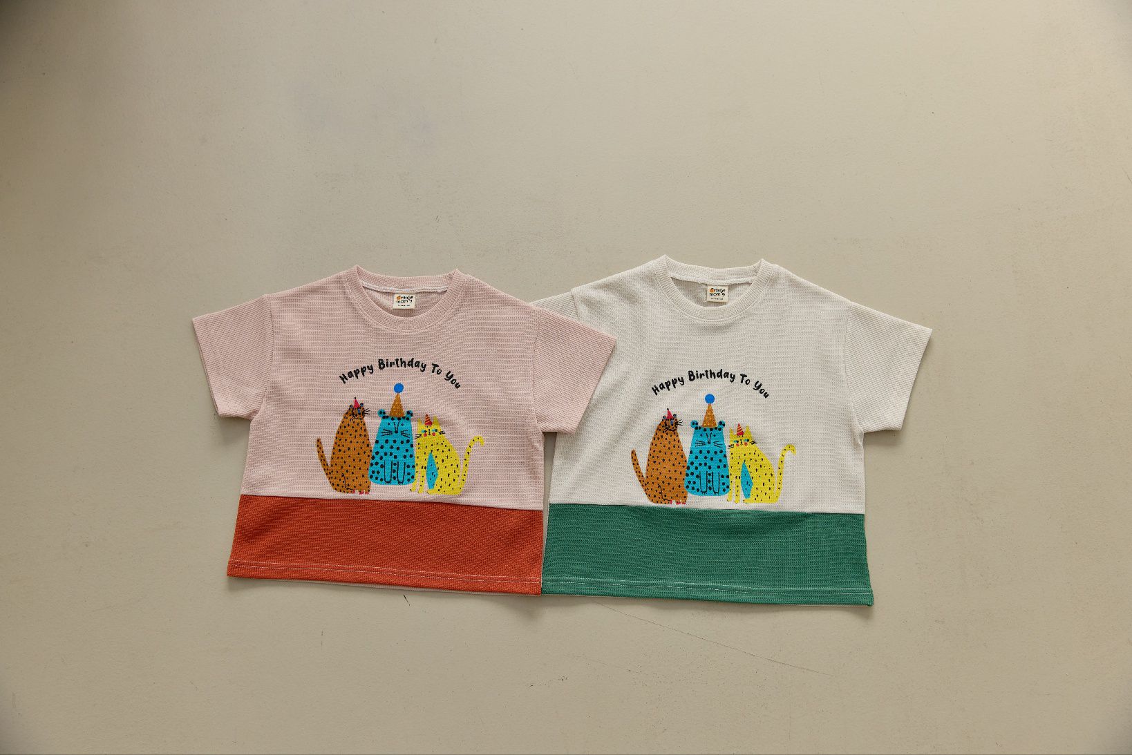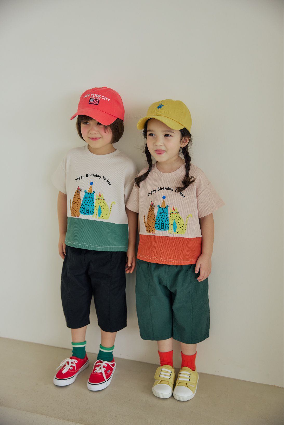 韓國 Orange Mom - 慶生豹喵撞色短袖上衣-粉X磚紅