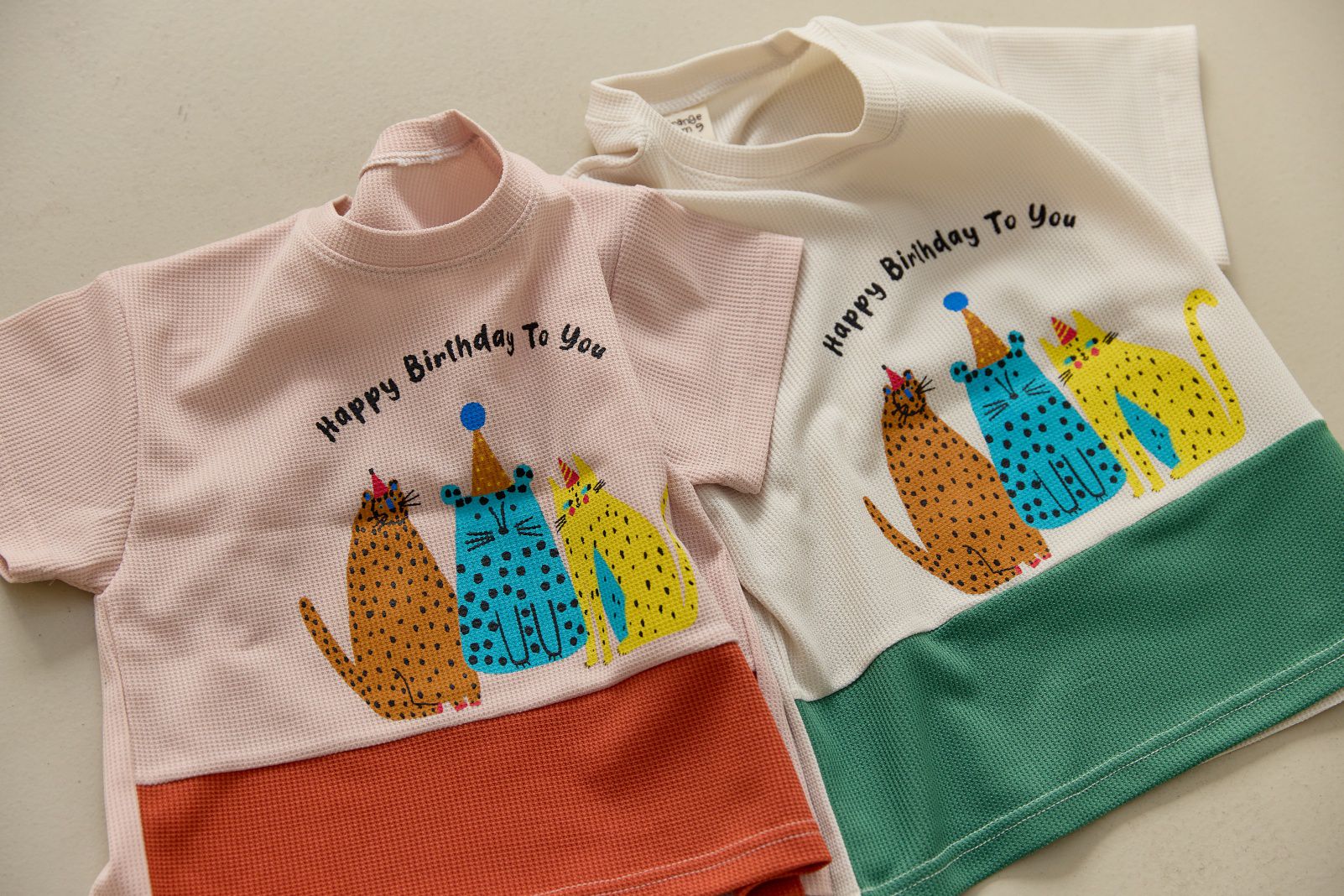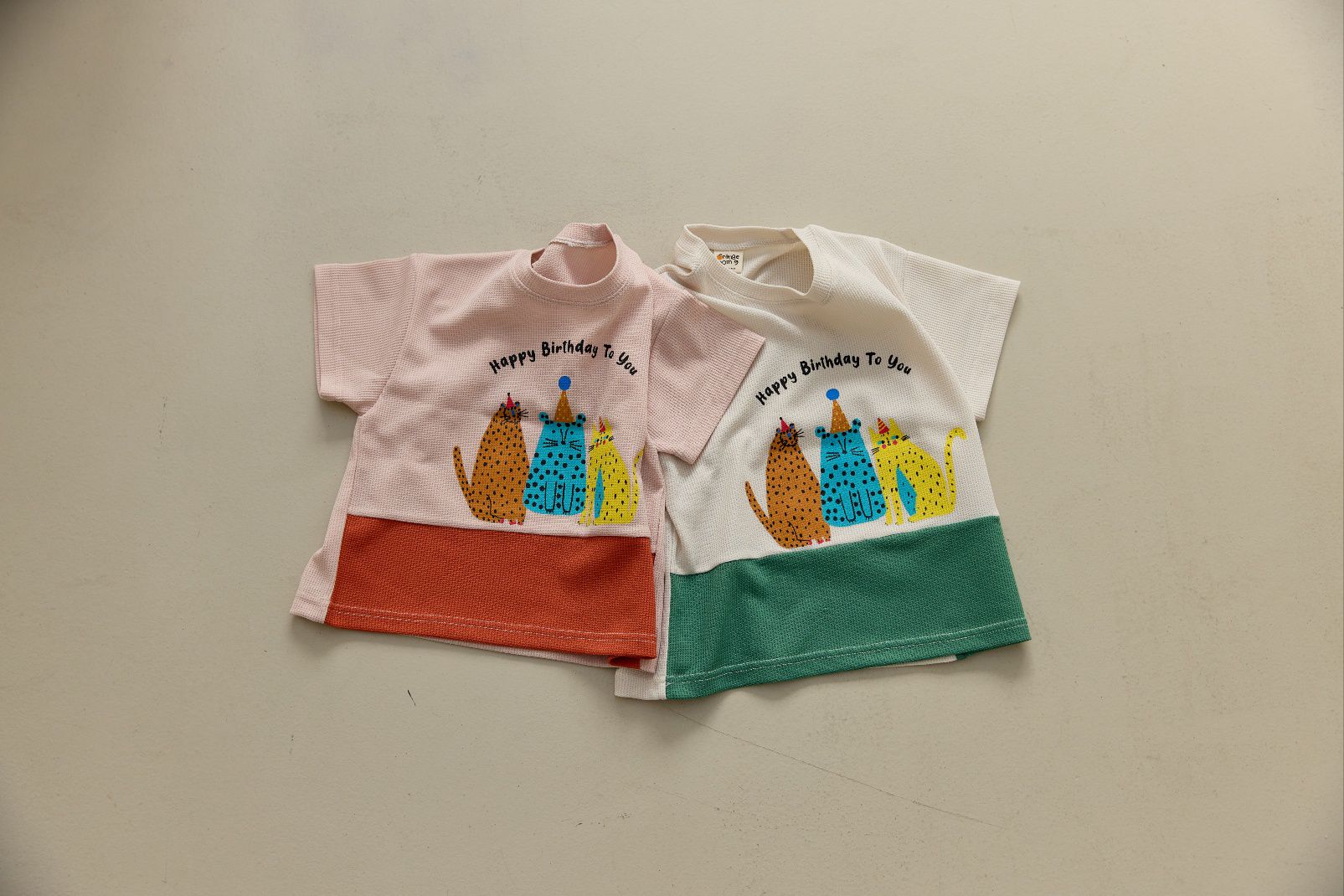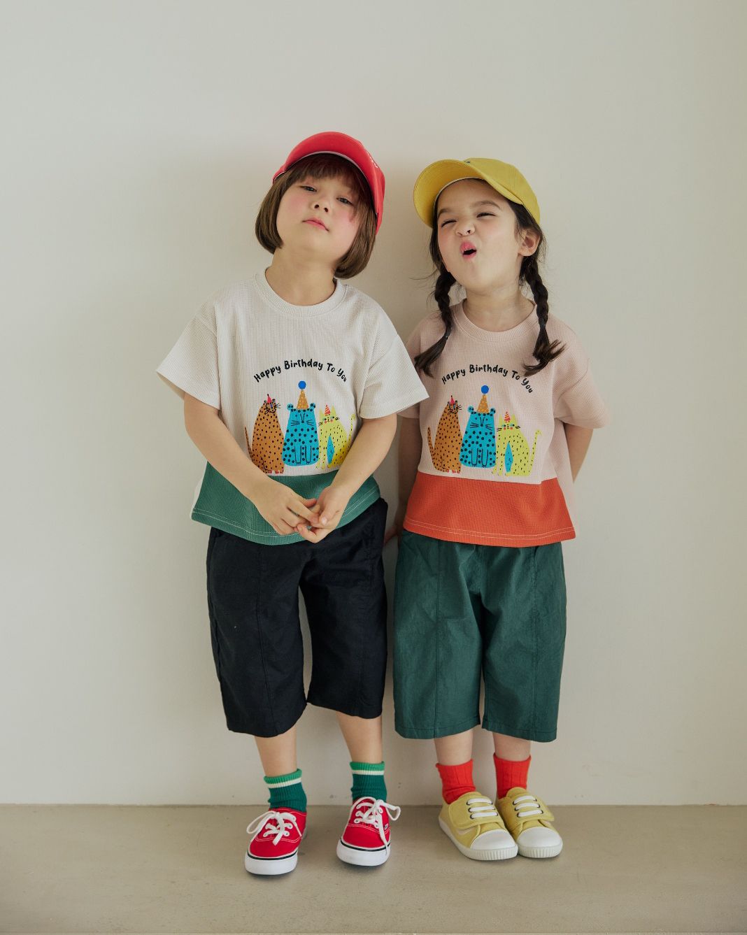 韓國 Orange Mom - 慶生豹喵撞色短袖上衣-粉X磚紅