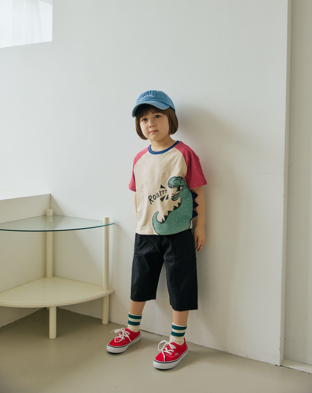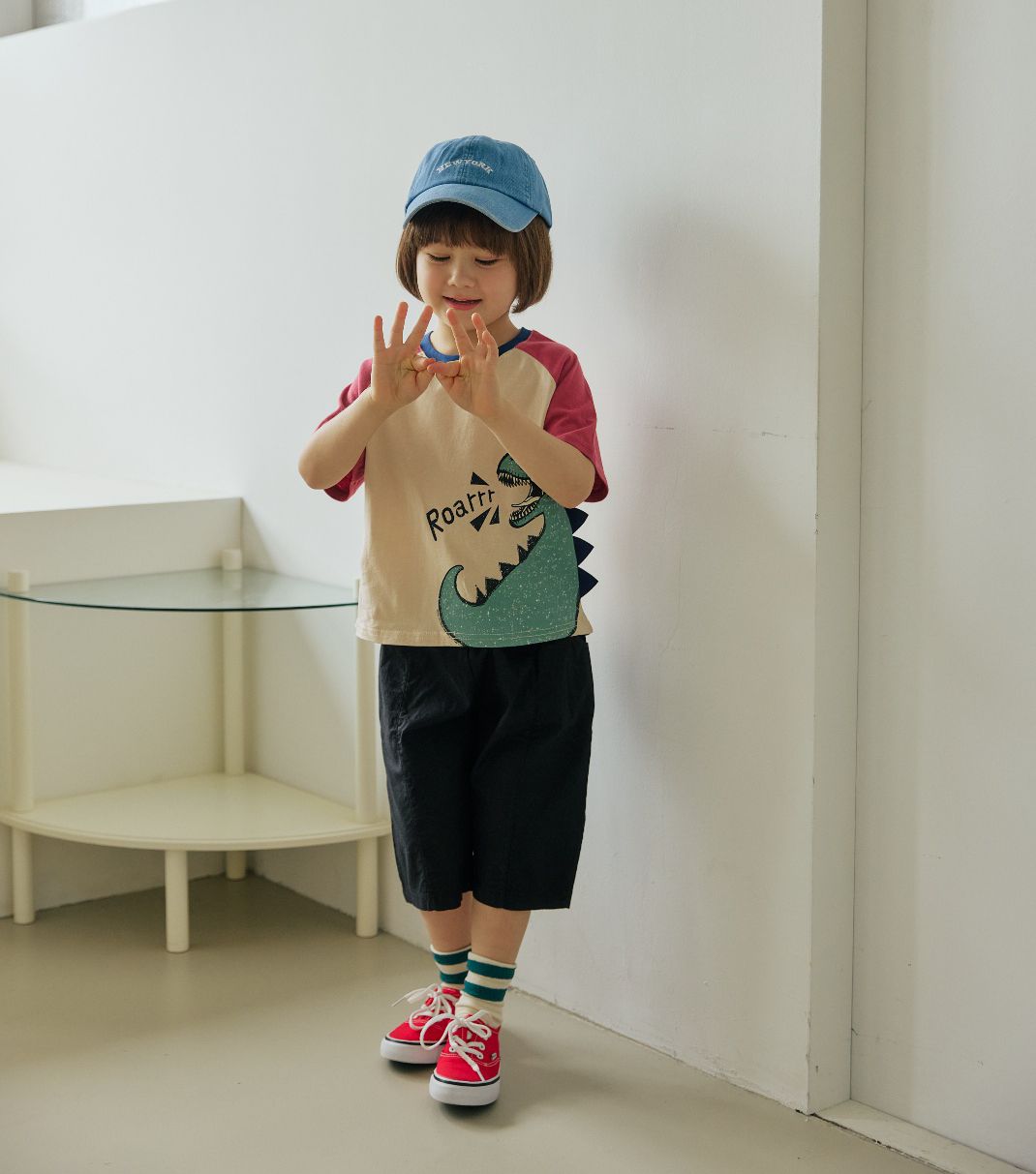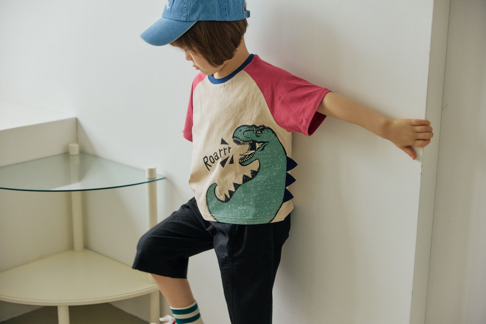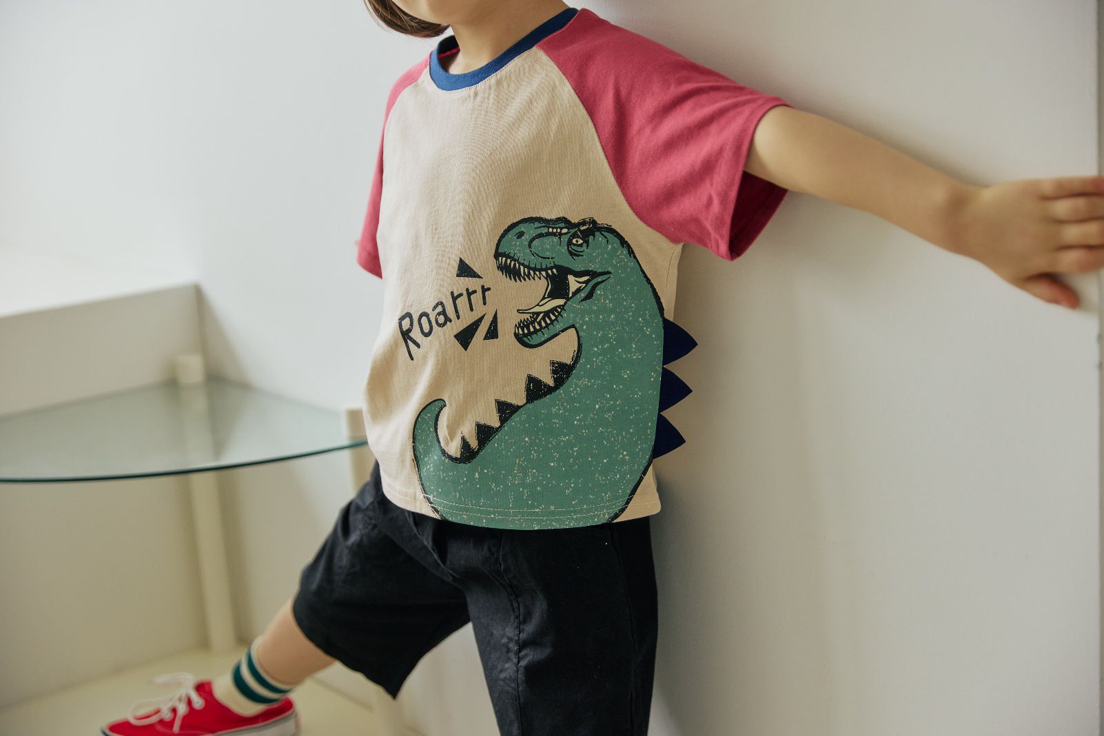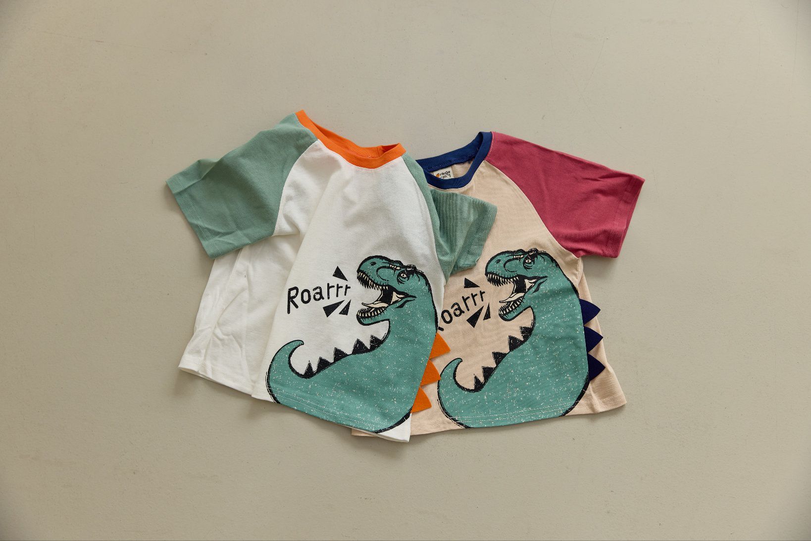 韓國 Orange Mom - 嘶吼恐龍撞色短袖上衣-米杏X酒紅