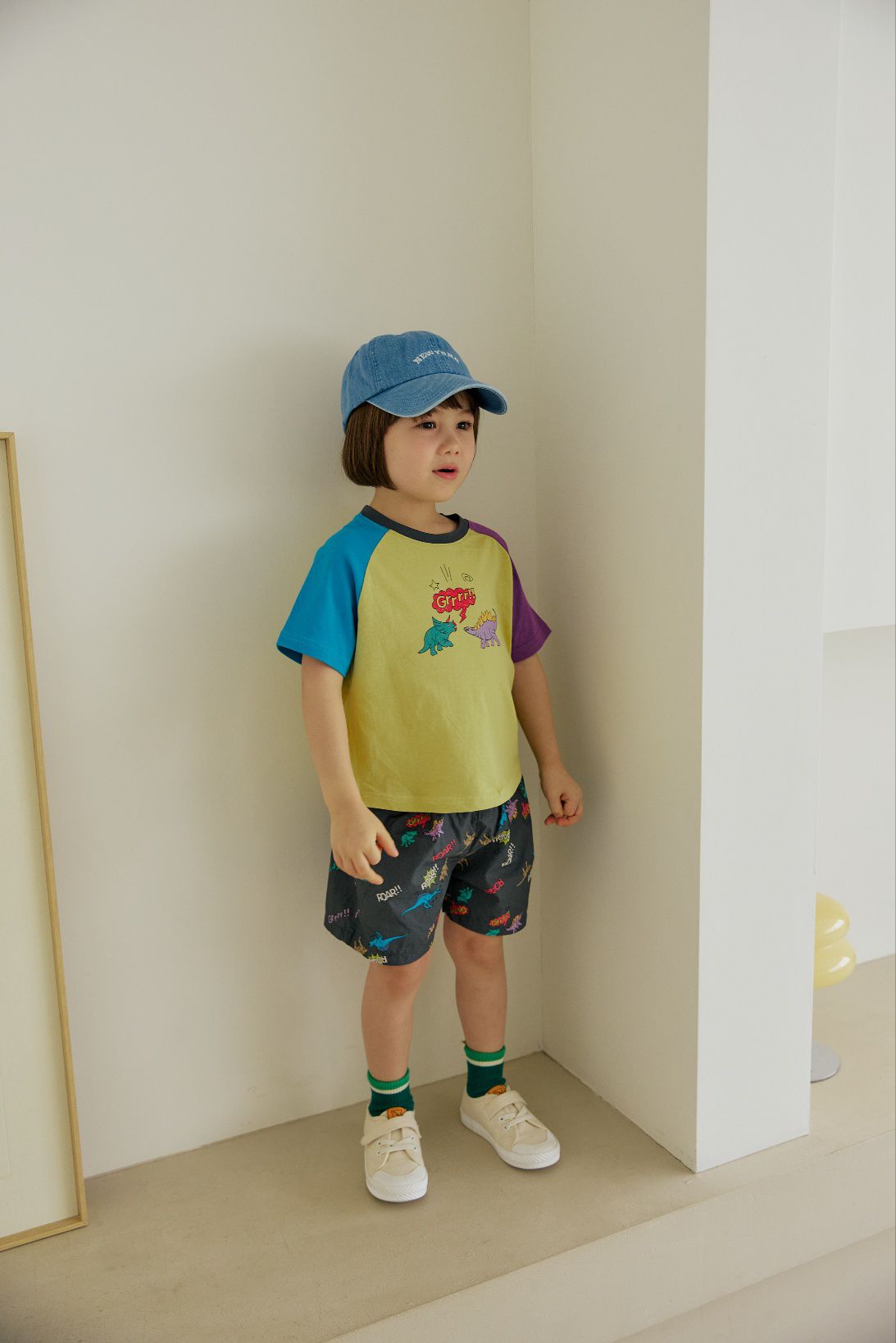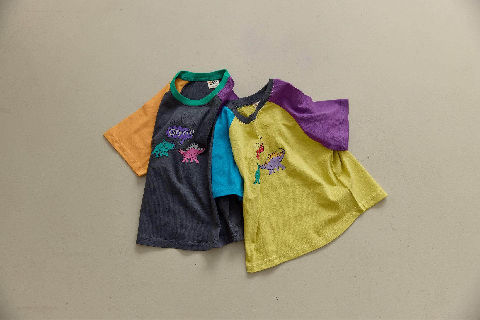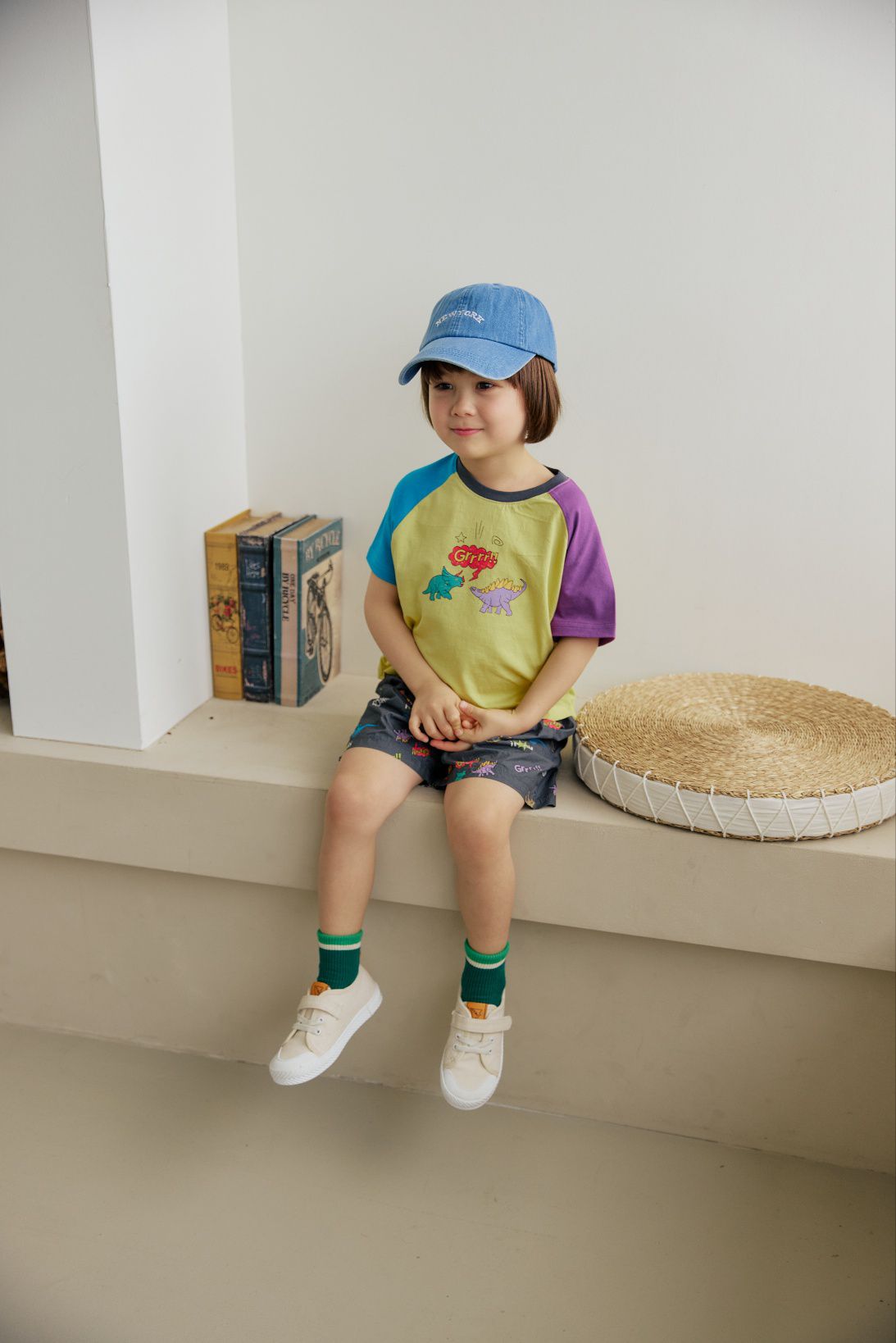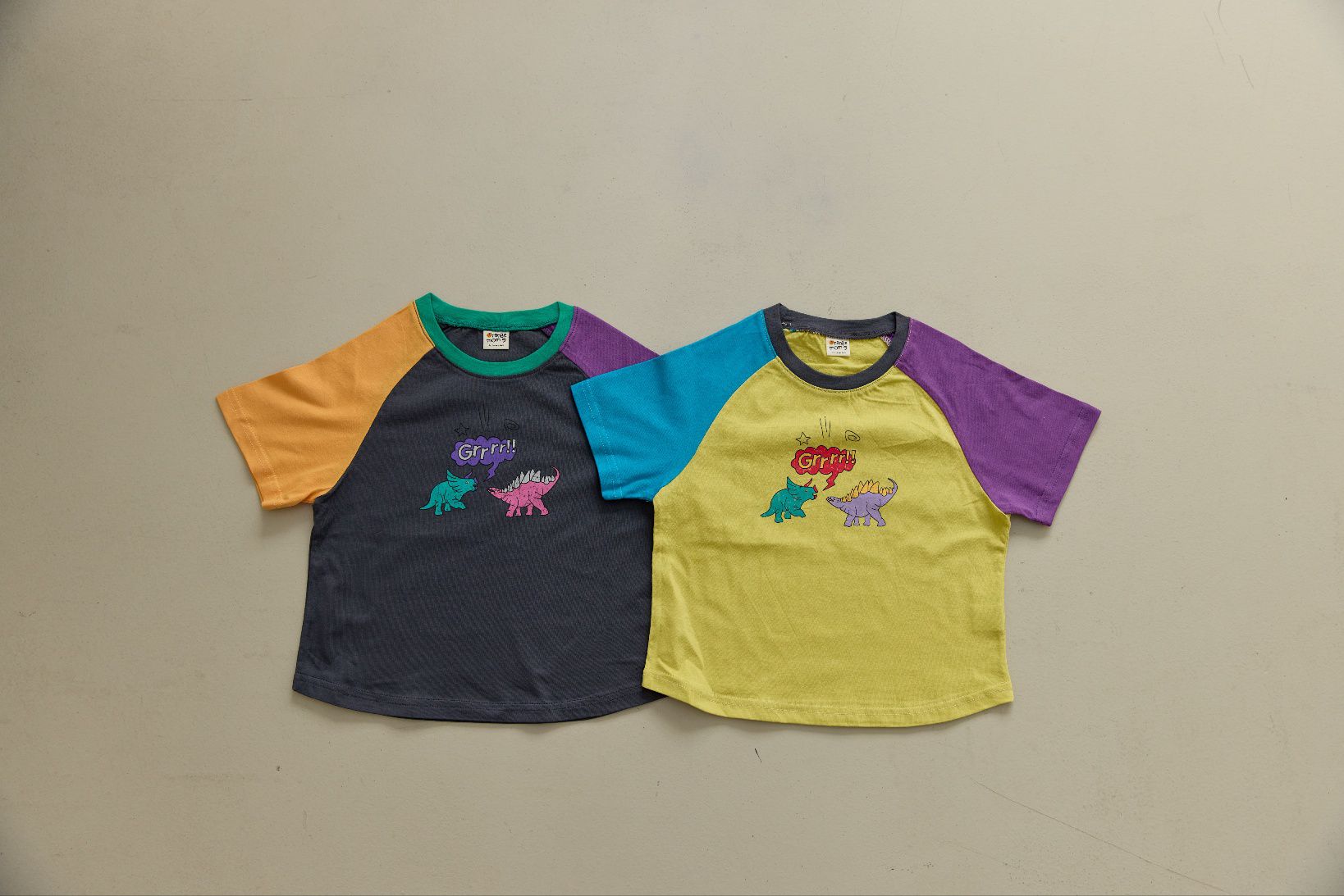 韓國 Orange Mom - 三角龍X劍龍撞色短袖上衣-藍X黃綠X紫
