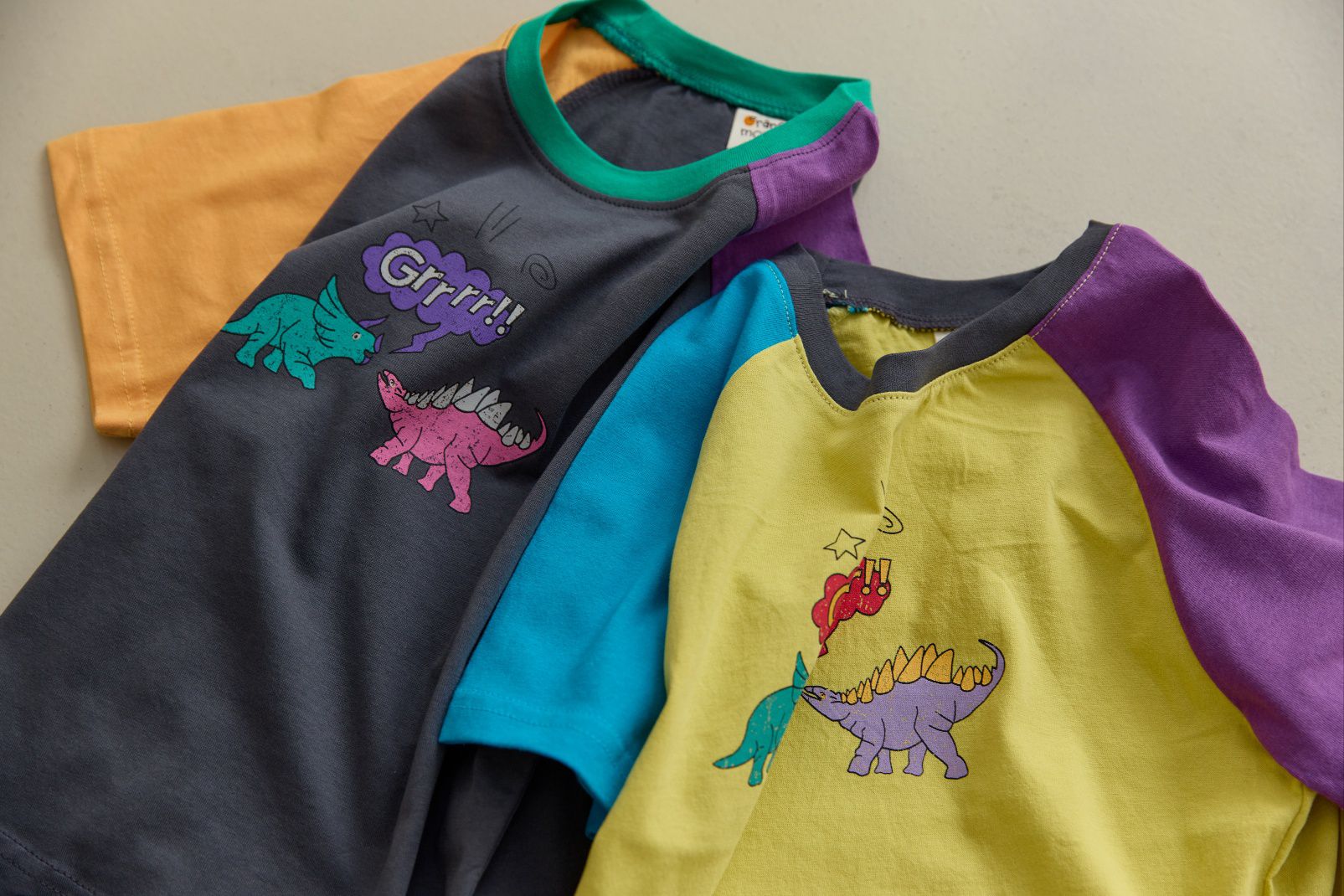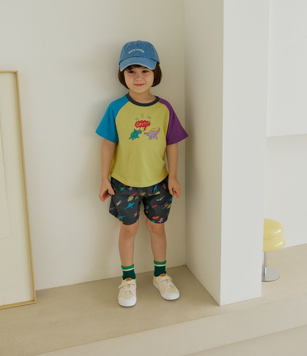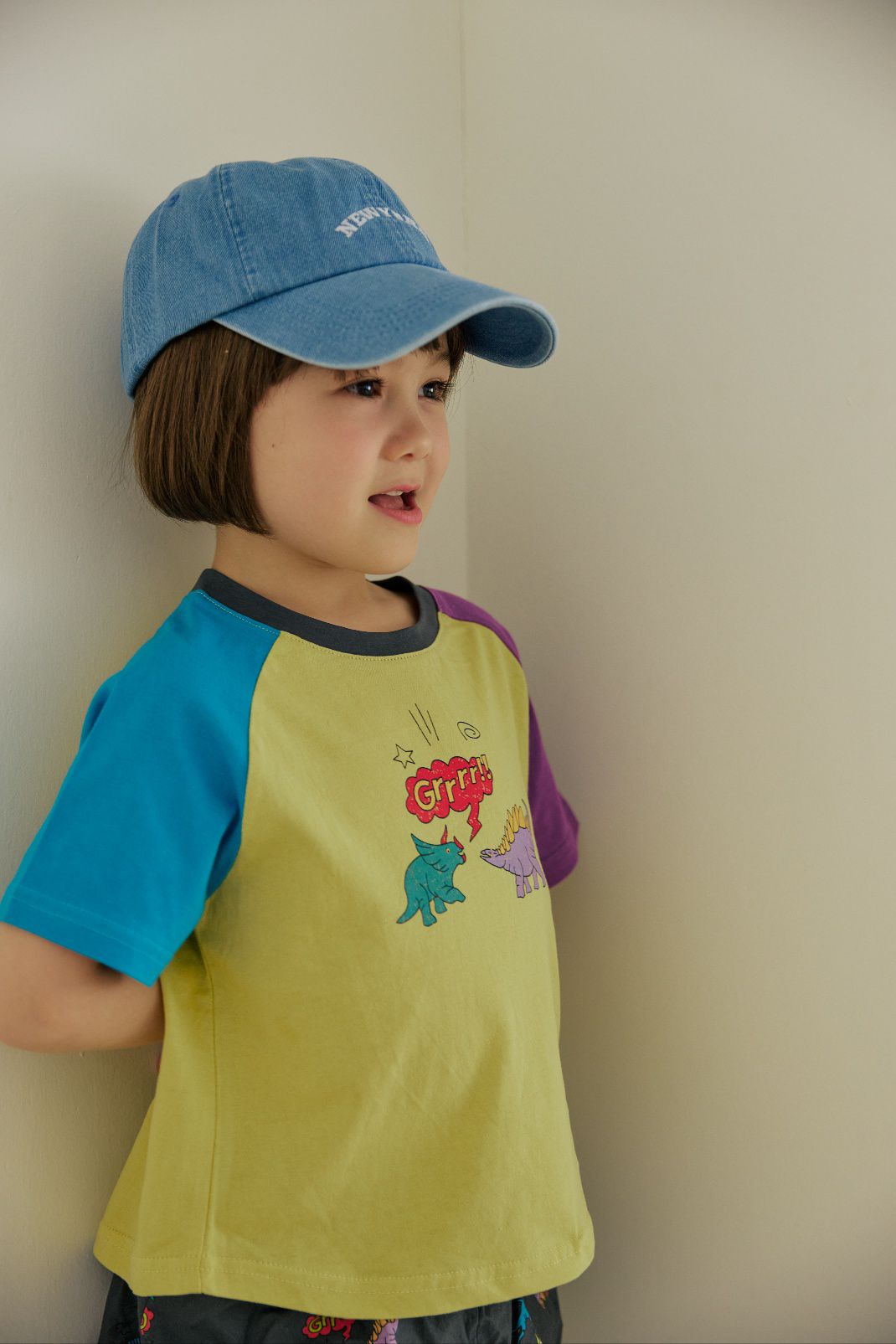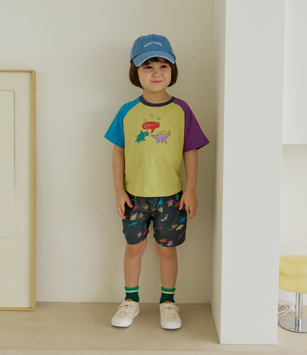 韓國 Orange Mom - 三角龍X劍龍撞色短袖上衣-藍X黃綠X紫