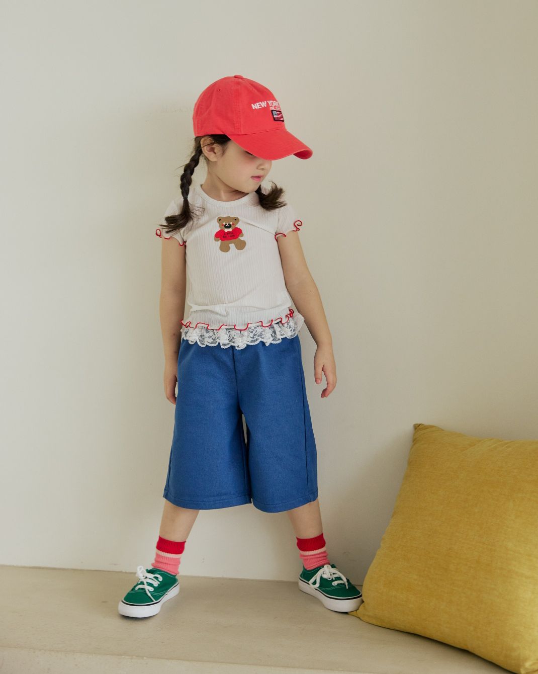 韓國 Orange Mom - 鬆緊腰蕾絲點綴過膝褲-深藍