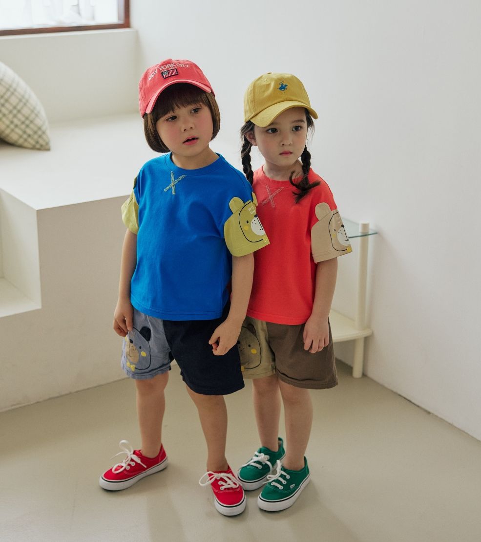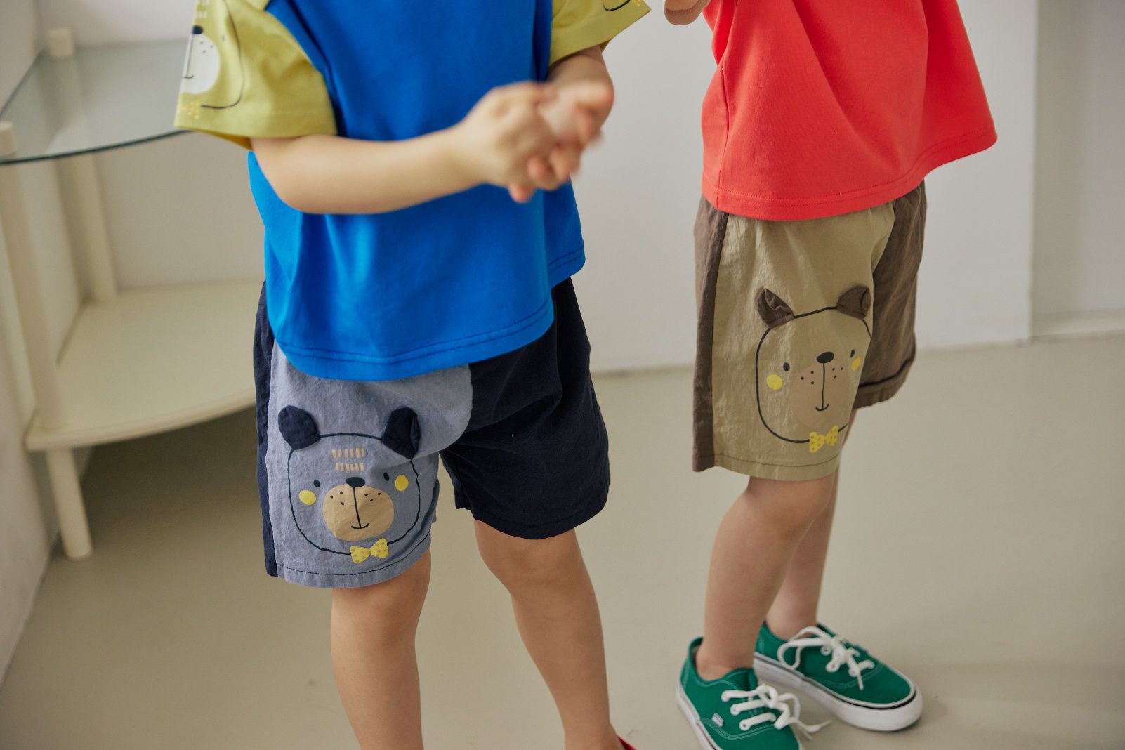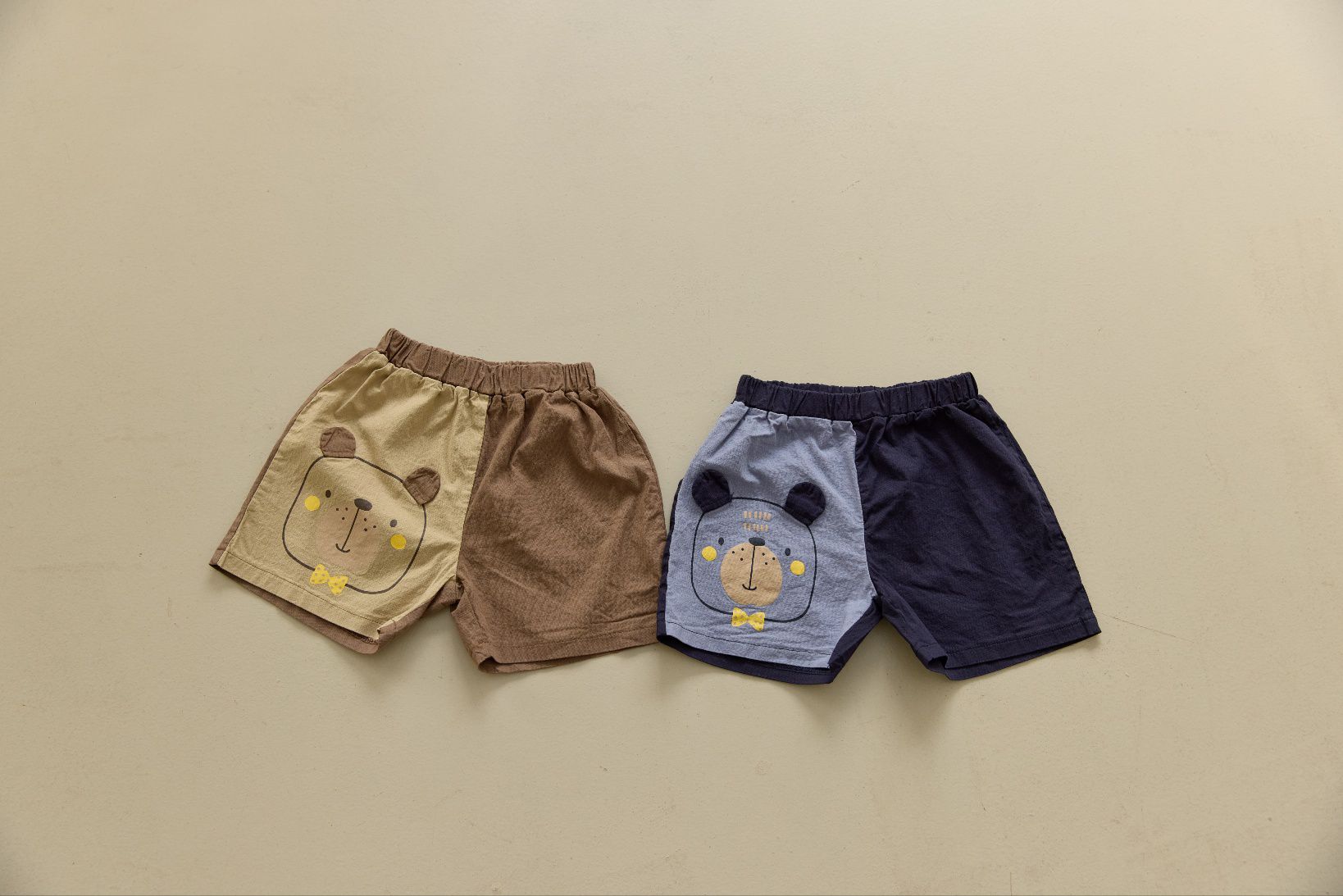 韓國 Orange Mom - 鬆緊腰塗鴉熊熊撞色短褲-灰藍X海軍藍