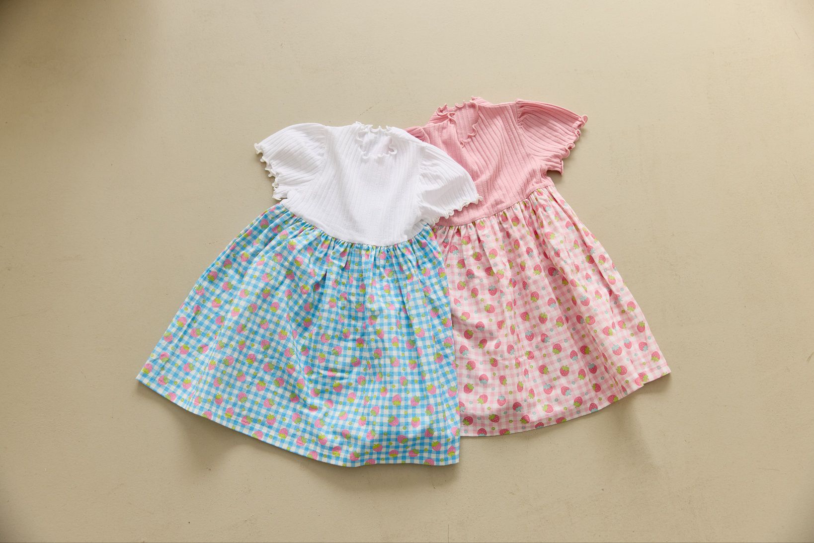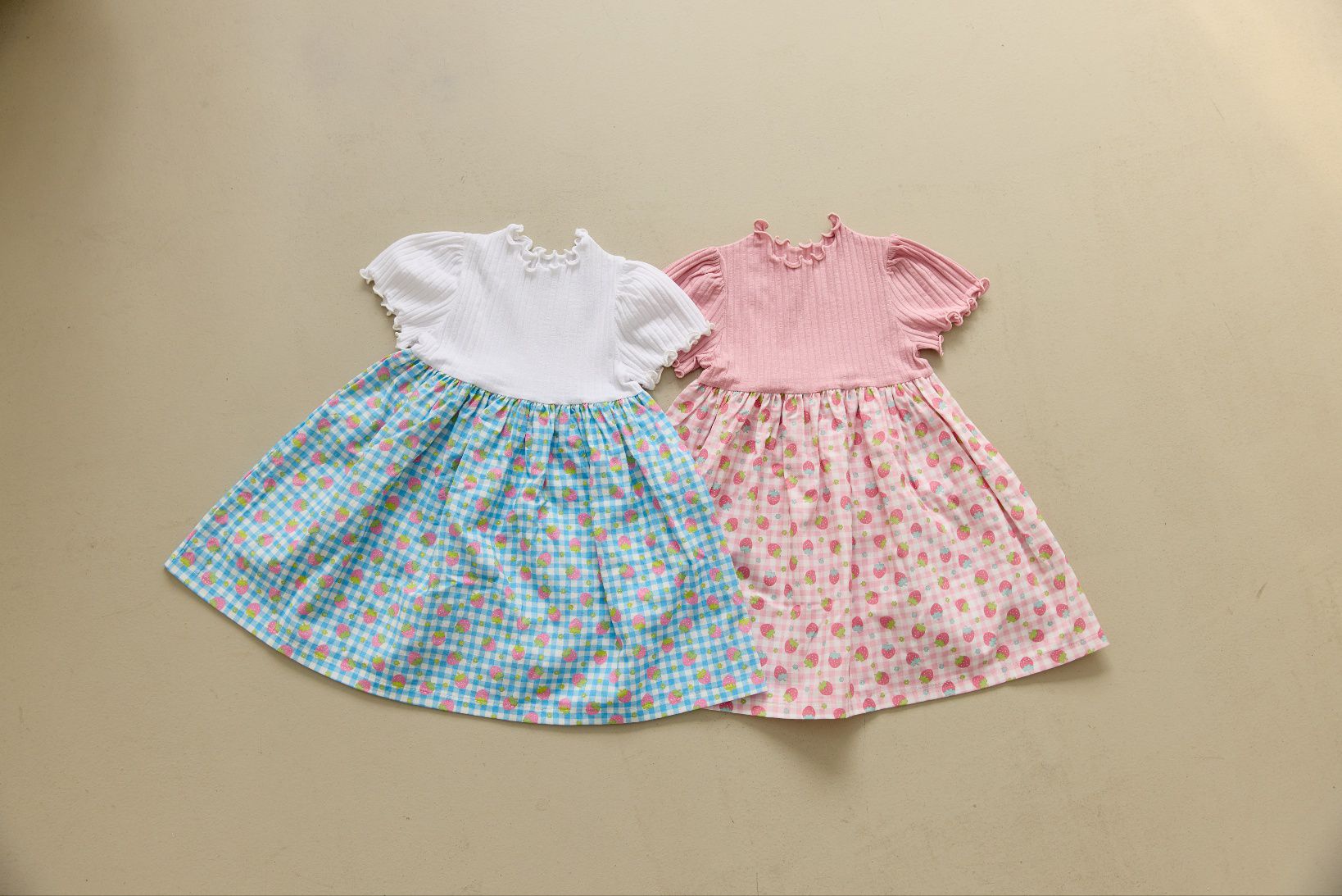 • 品名:木耳邊拼接草莓格紋短袖洋裝