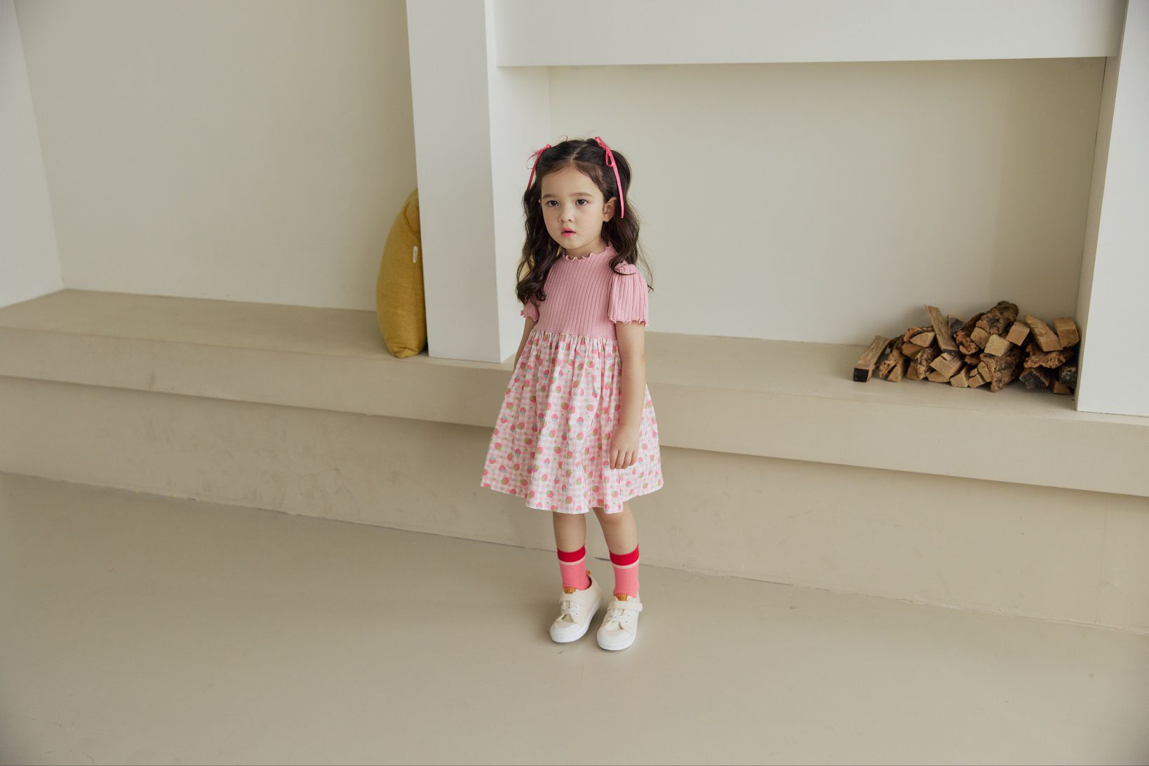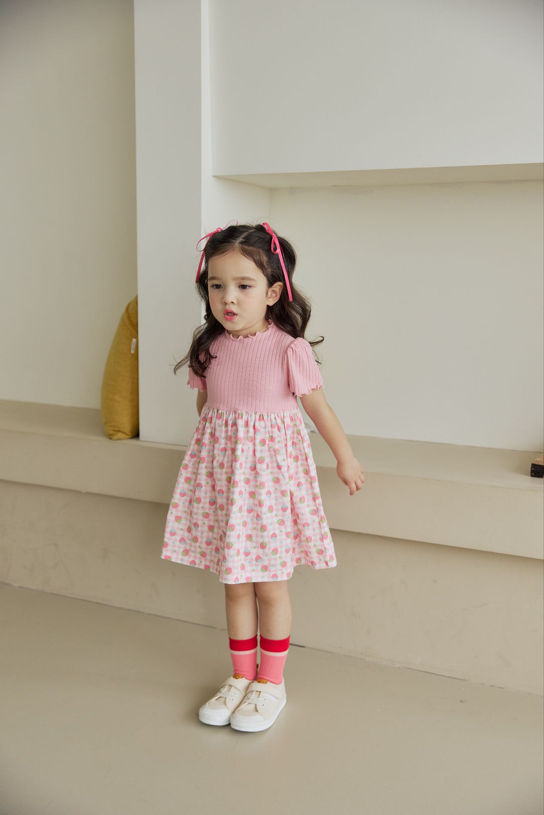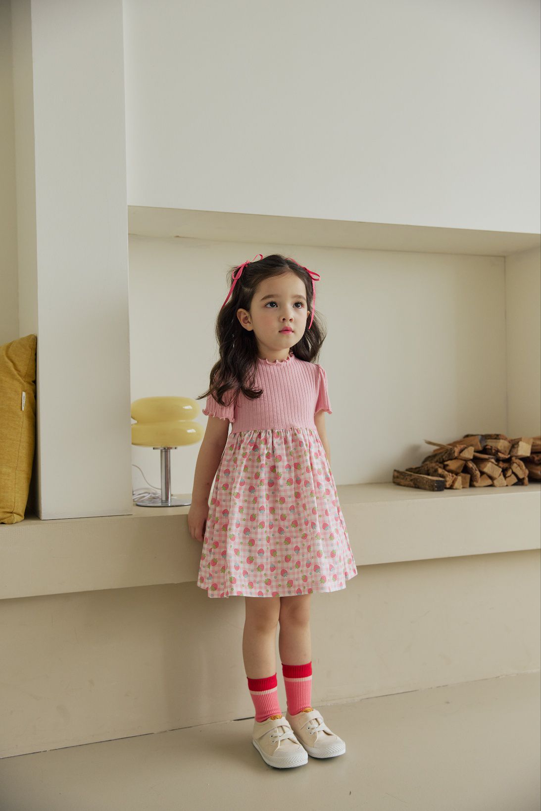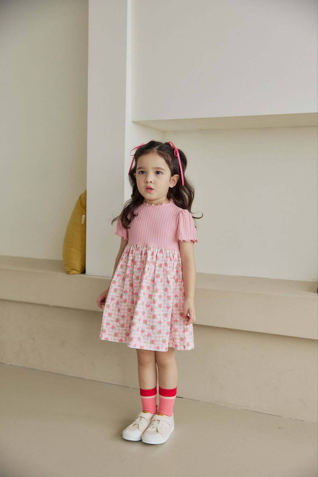 韓國 Orange Mom - 木耳邊拼接草莓格紋短袖洋裝-粉