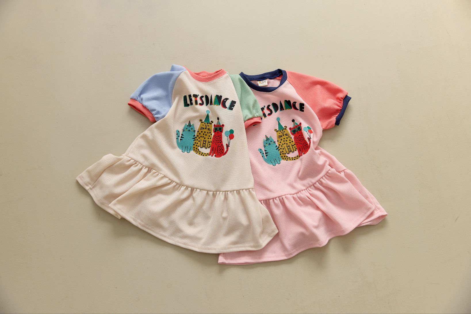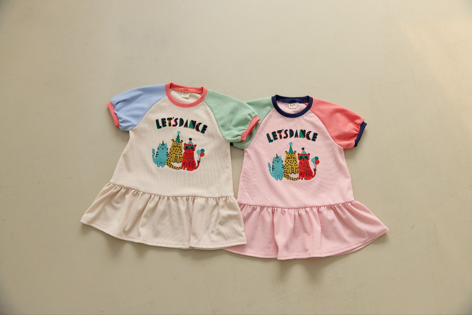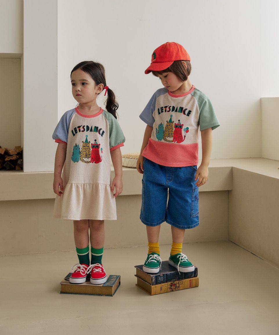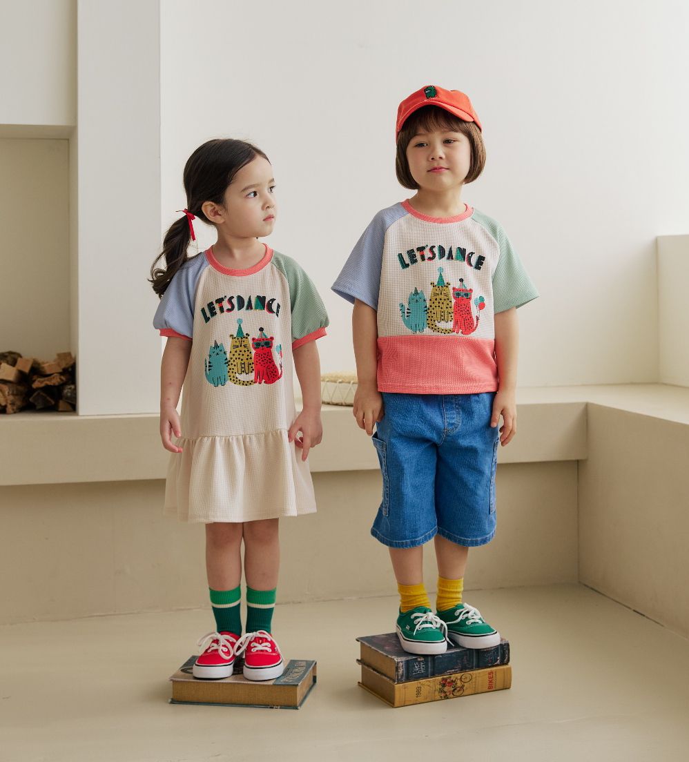韓國 Orange Mom - 派對豹喵撞色拼接短袖洋裝-米