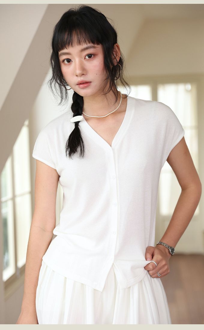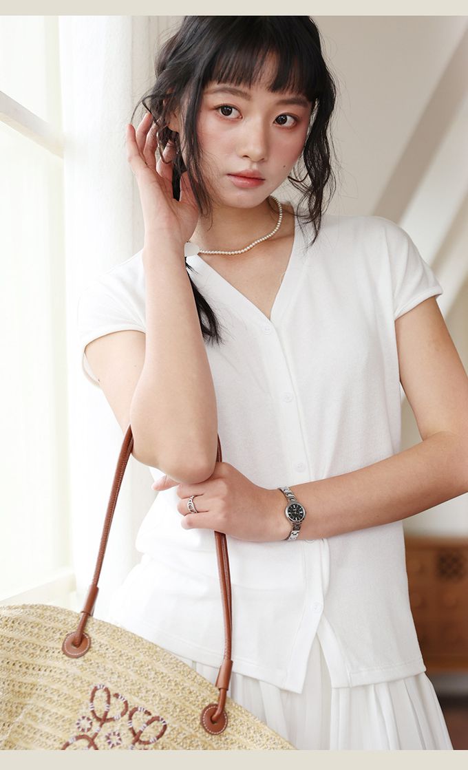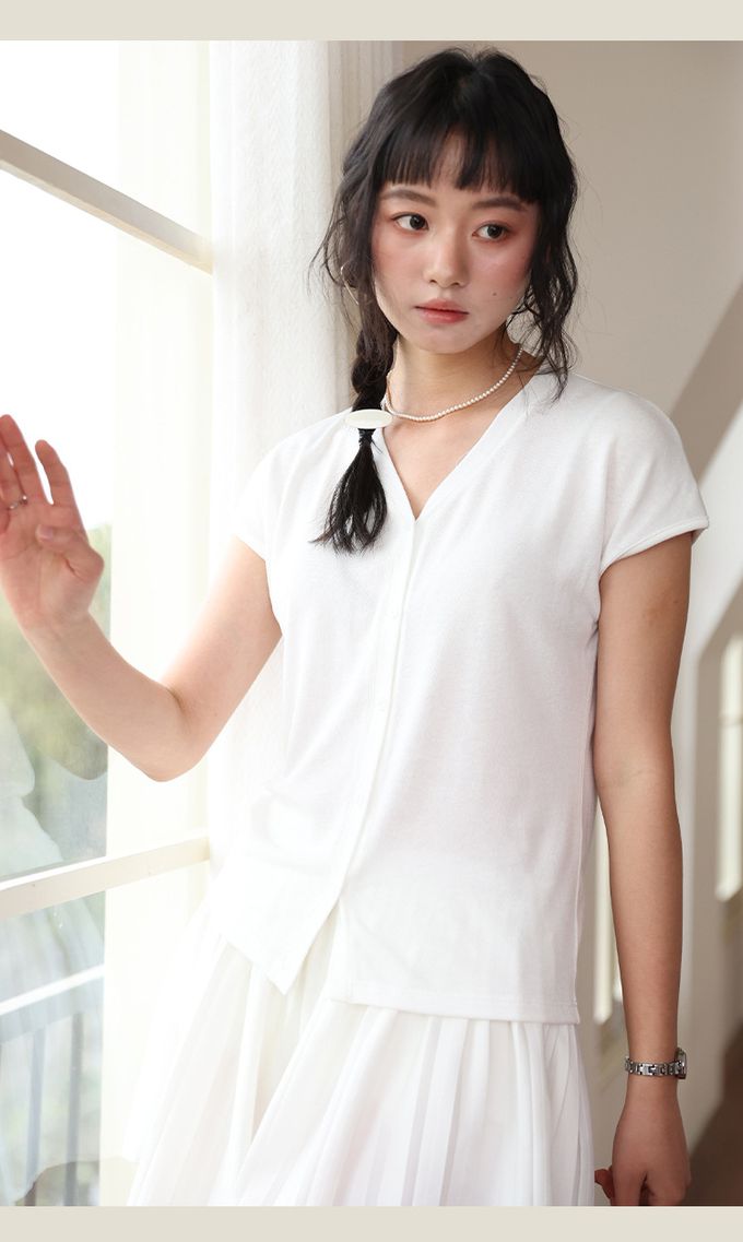 天絲亞麻顯瘦V領法式袖上衣-珍珠白