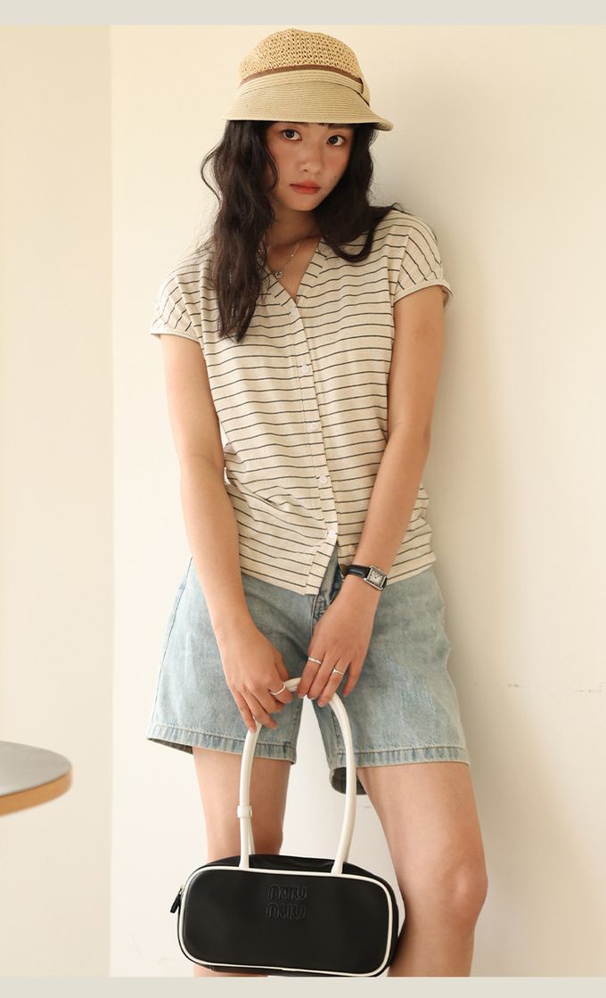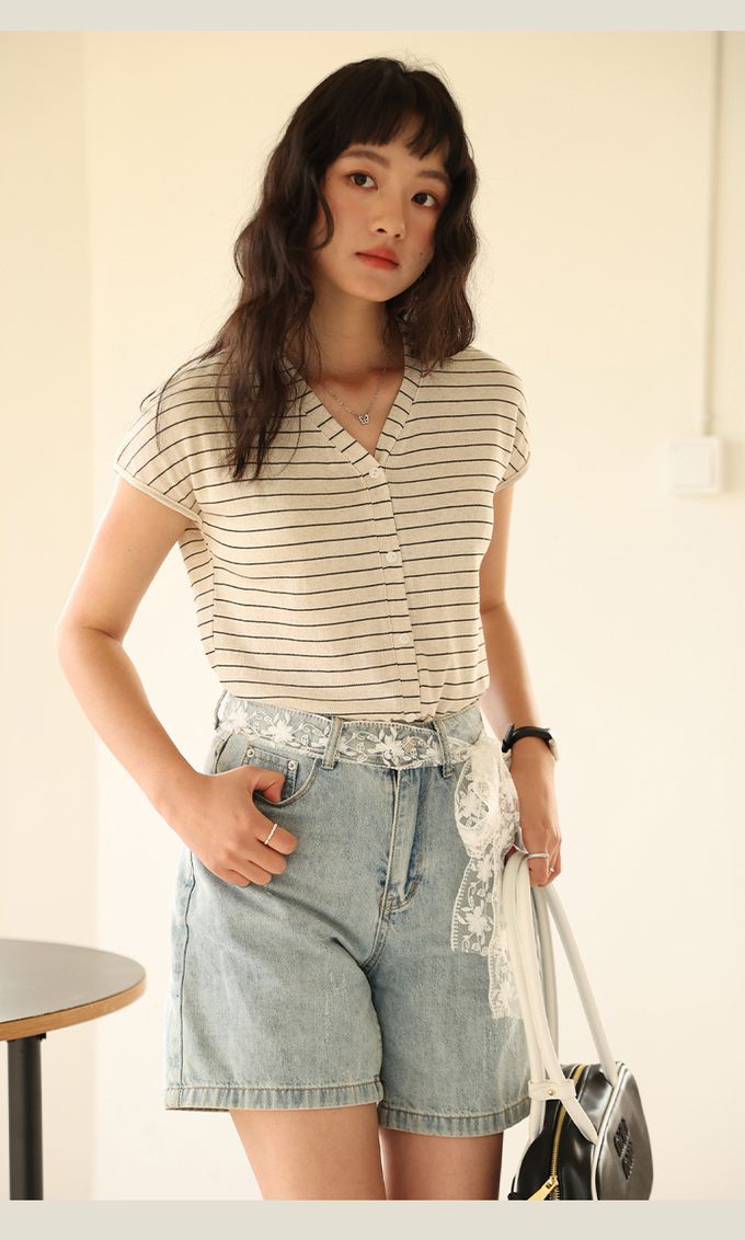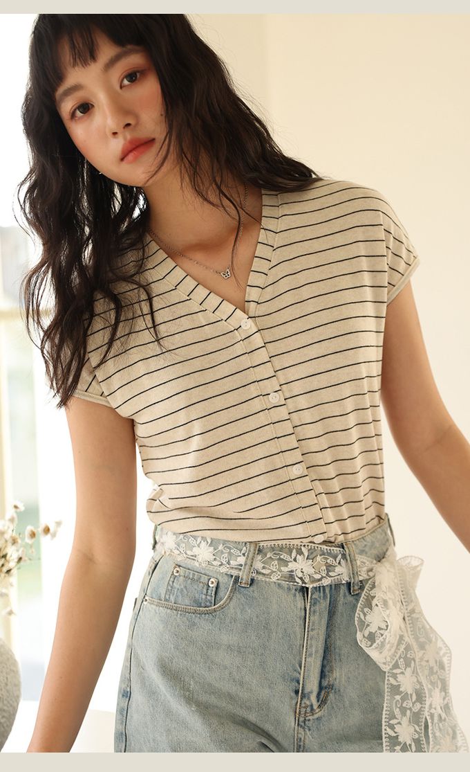 KPUWARM - 天絲亞麻顯瘦V領法式袖上衣-燕麥條
