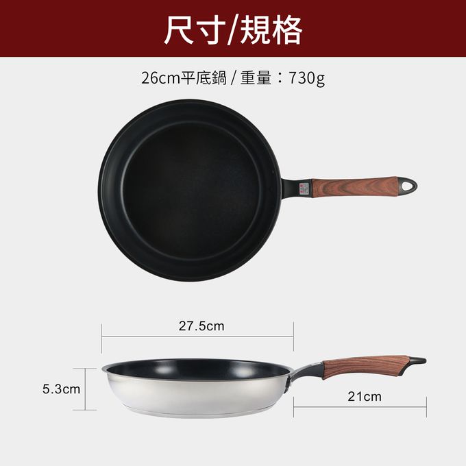 尺寸: 內徑26cm、外徑27.5cm、高5.3cm、柄長21cm、全長48cm