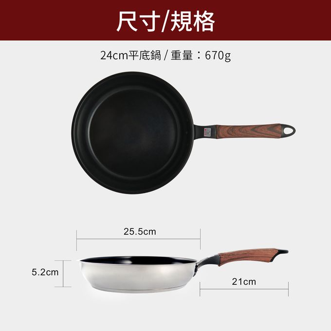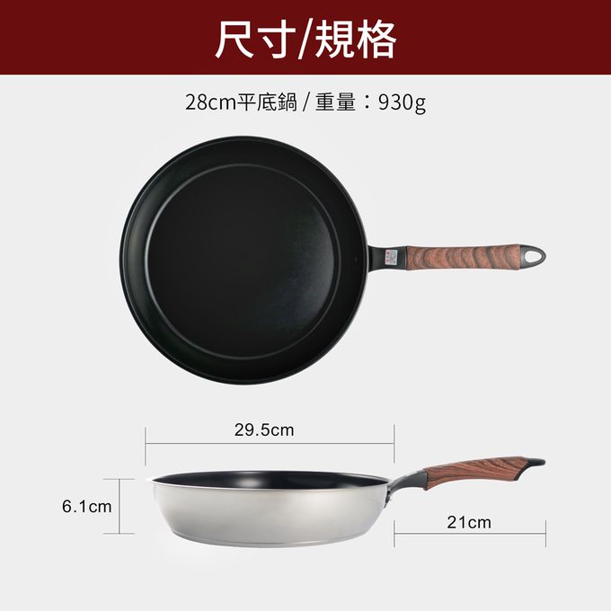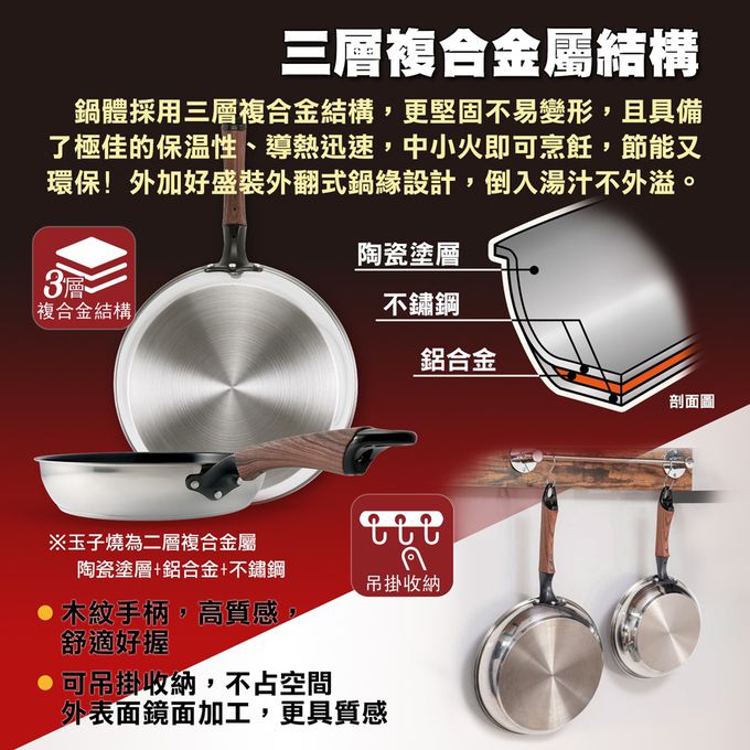 材質: 主體/中-鋁合金 ; 內+外-不鏽鋼、內塗層/陶瓷塗層、手柄/酚醛樹脂+木紋轉印