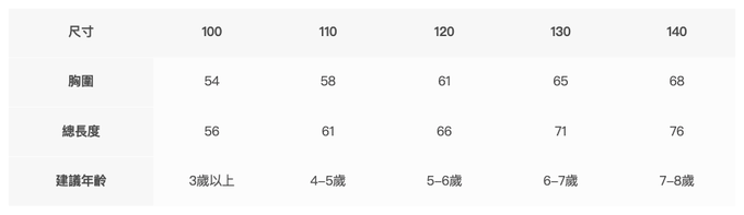2. 平均尺寸表乃參考平均值制定,每位孩童成長速度略有不同,請參考孩子實際體型、現有衣物尺寸等實際測量結果進行選購。
