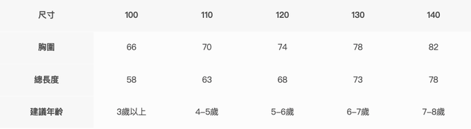 2. 平均尺寸表乃參考平均值制定,每位孩童成長速度略有不同,請參考孩子實際體型、現有衣物尺寸等實際測量結果進行選購。