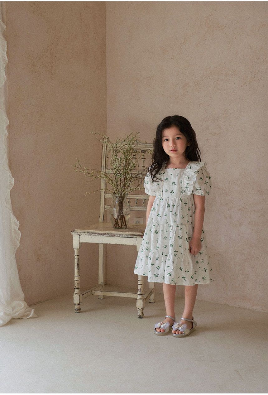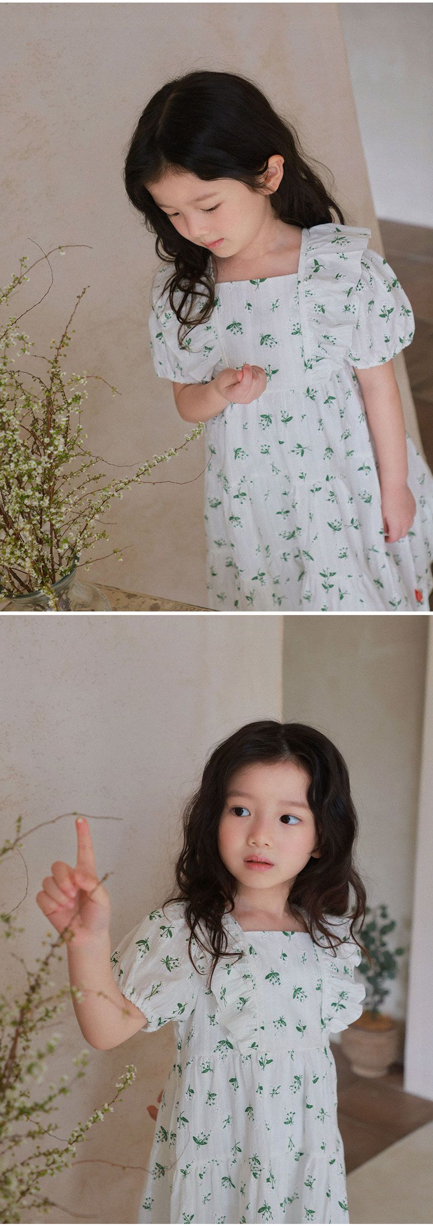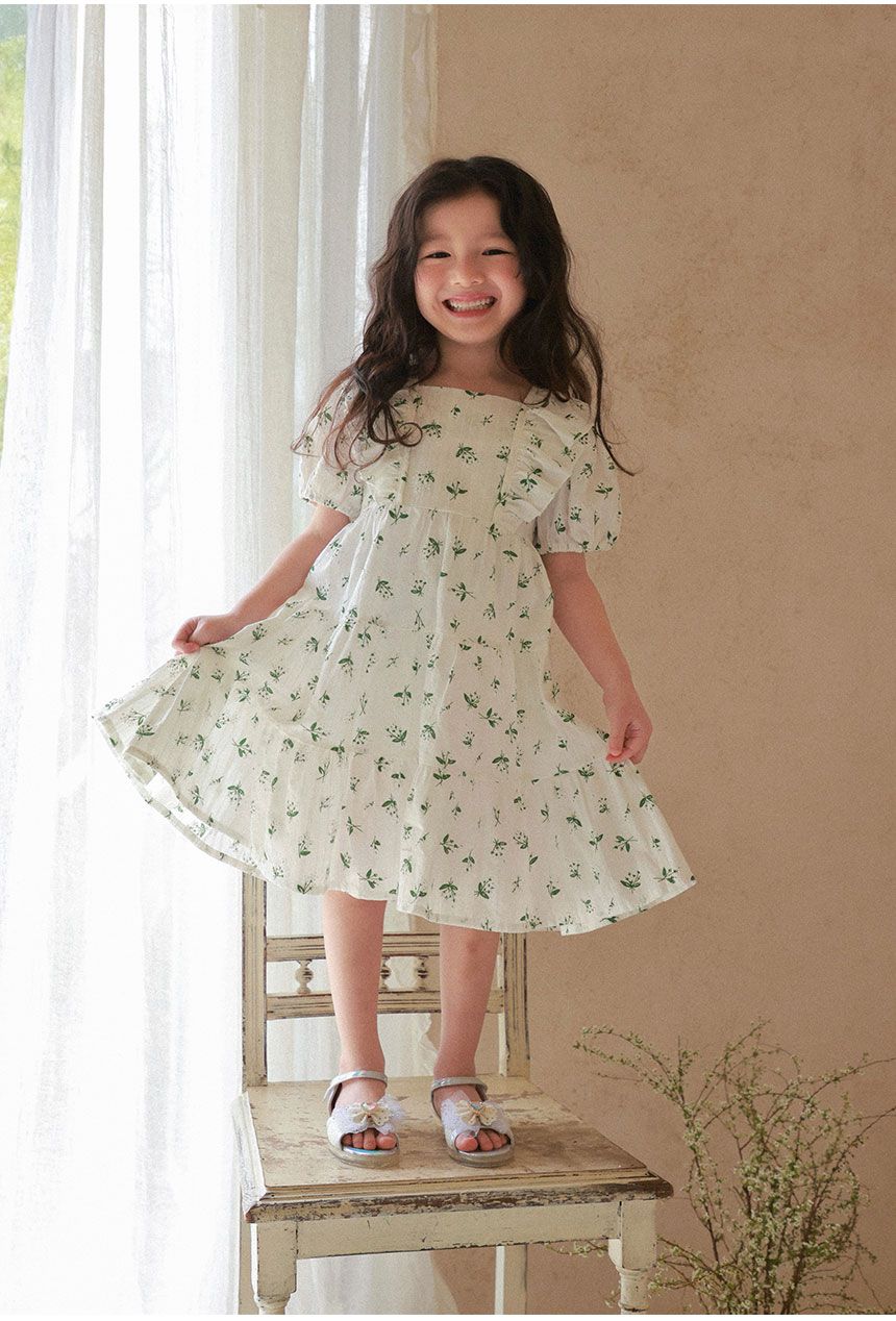 韓國 OZKIZ - 清新白花點葉紋泡泡袖洋裝-白