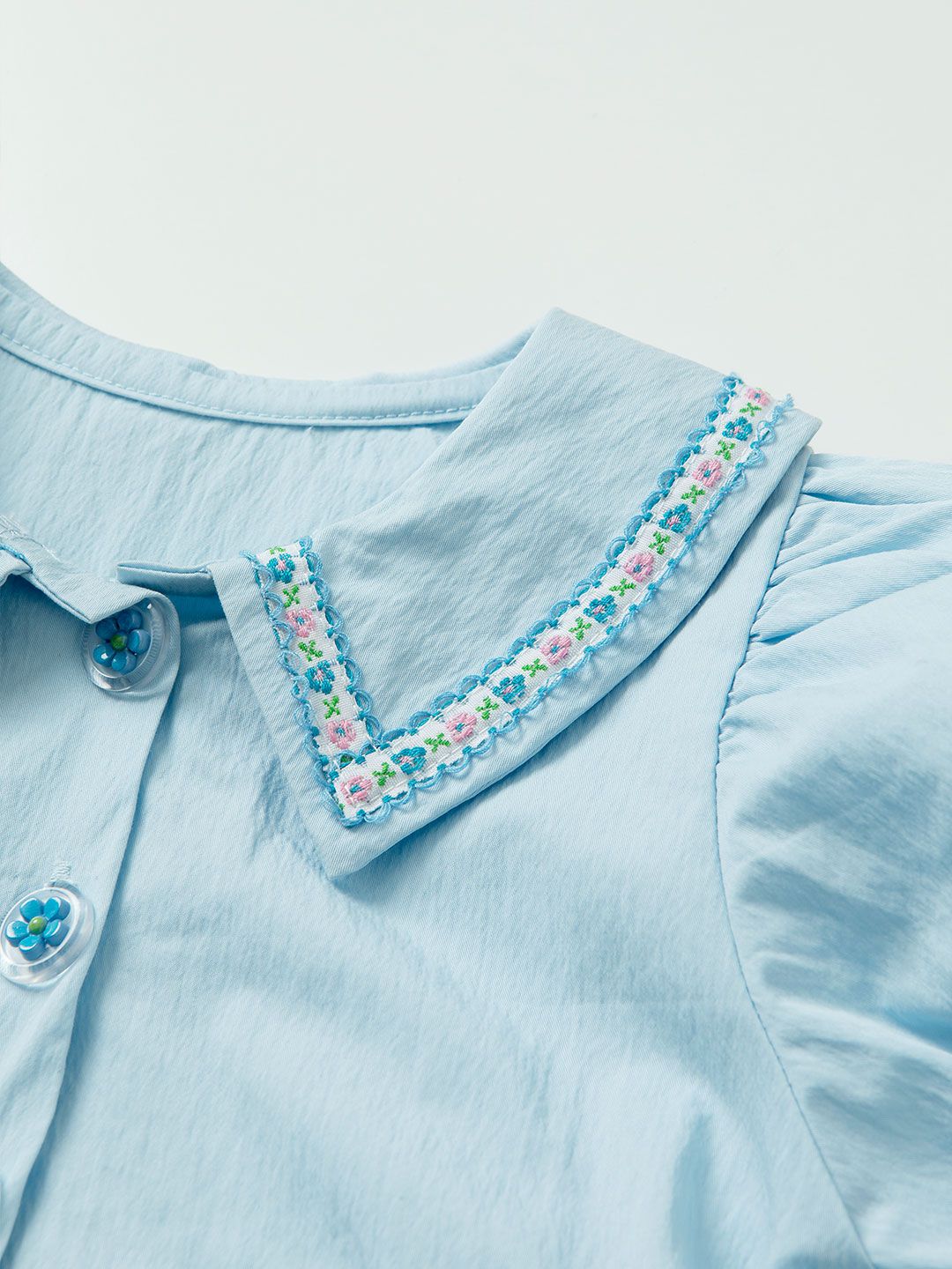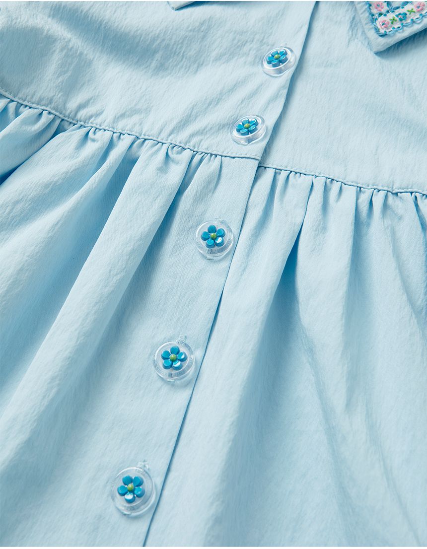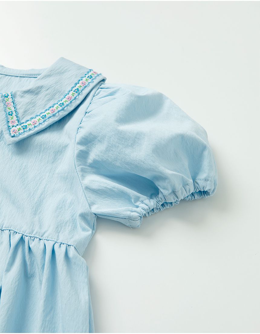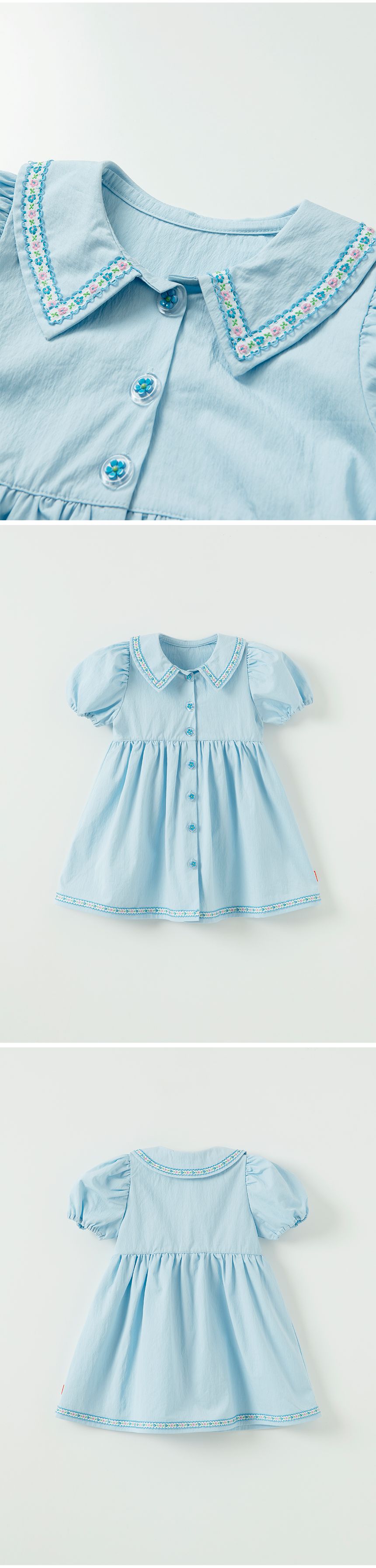 韓國 OZKIZ - 刺繡小花翻領排釦泡泡袖洋裝-天藍