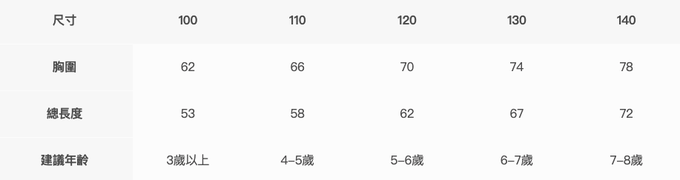 2. 平均尺寸表乃參考平均值制定,每位孩童成長速度略有不同,請參考孩子實際體型、現有衣物尺寸等實際測量結果進行選購。