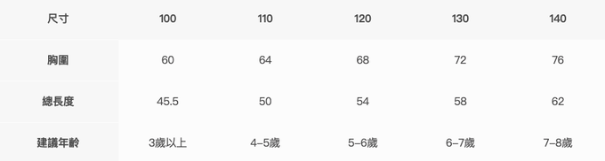 2. 平均尺寸表乃參考平均值制定,每位孩童成長速度略有不同,請參考孩子實際體型、現有衣物尺寸等實際測量結果進行選購。