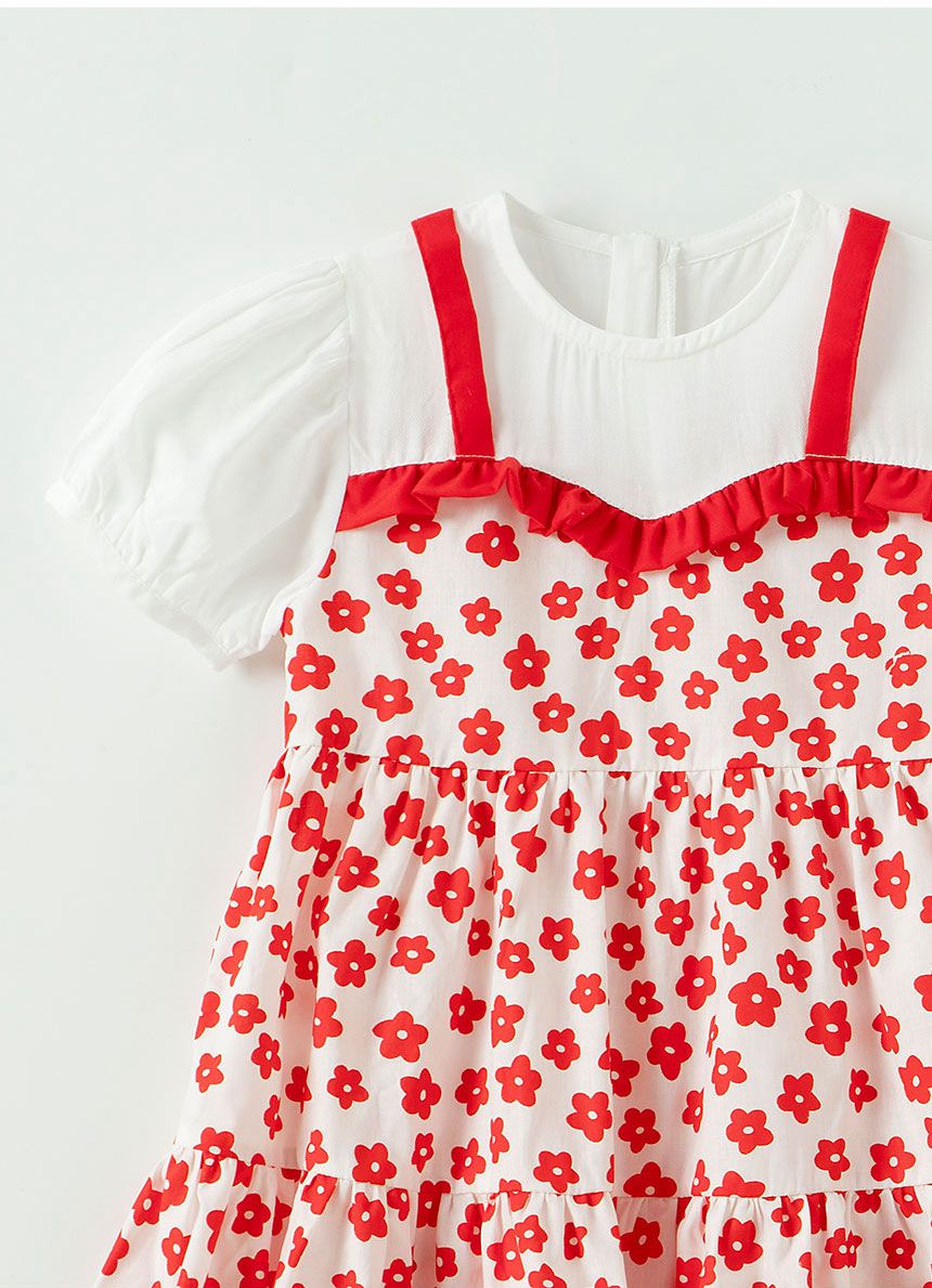 • 品名:紅花印拼接泡泡袖洋裝