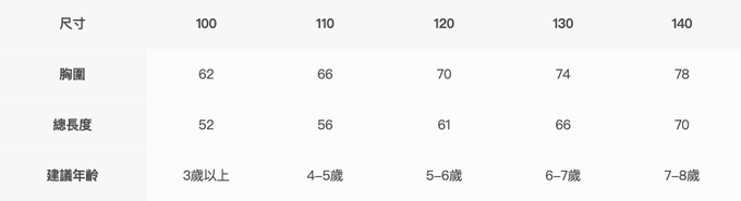 2. 平均尺寸表乃參考平均值制定,每位孩童成長速度略有不同,請參考孩子實際體型、現有衣物尺寸等實際測量結果進行選購。