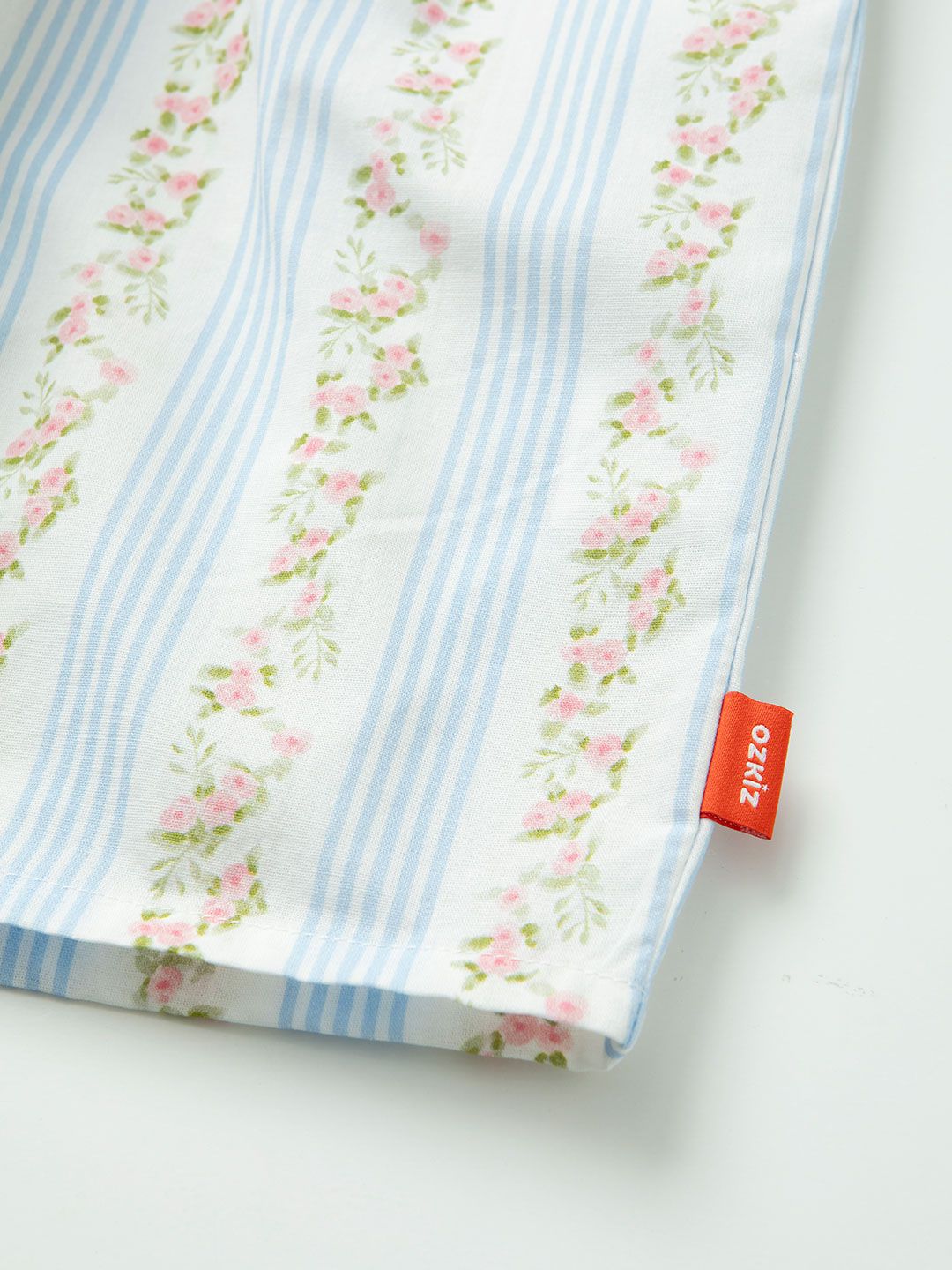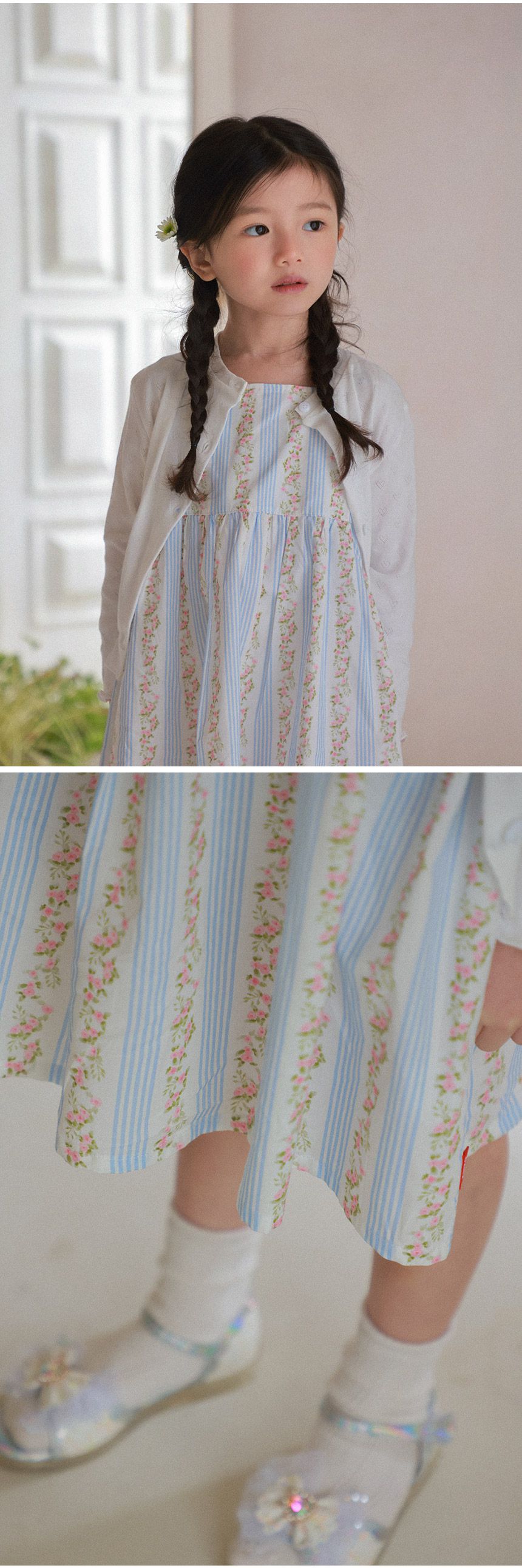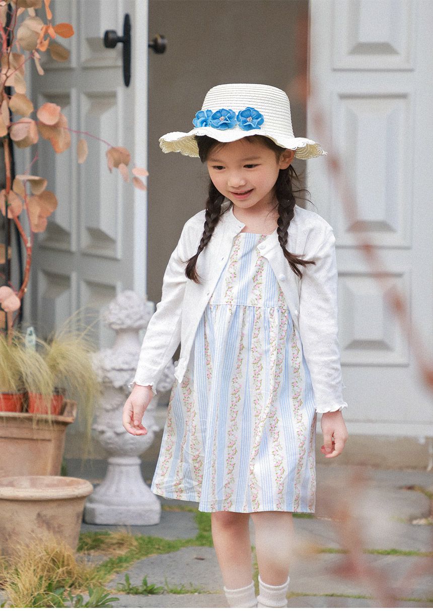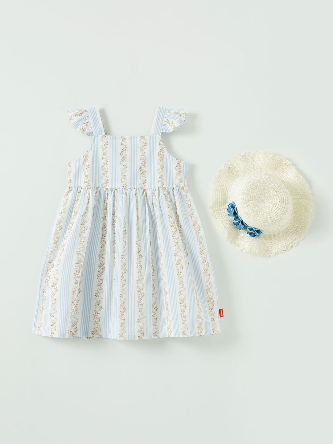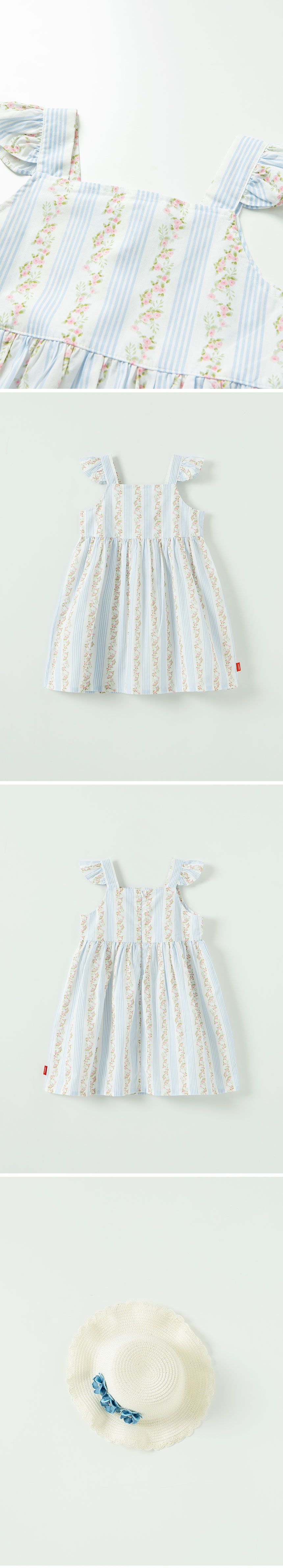 韓國 OZKIZ - (附帽子)清爽碎花直紋細肩帶洋裝-淺藍