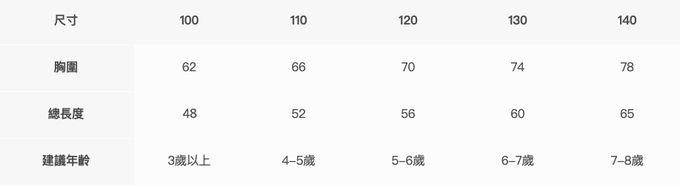2. 平均尺寸表乃參考平均值制定,每位孩童成長速度略有不同,請參考孩子實際體型、現有衣物尺寸等實際測量結果進行選購。