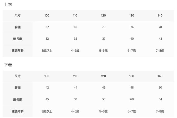 2. 平均尺寸表乃參考平均值制定,每位孩童成長速度略有不同,請參考孩子實際體型、現有衣物尺寸等實際測量結果進行選購。