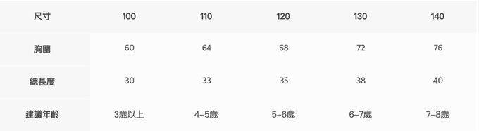 2. 平均尺寸表乃參考平均值制定,每位孩童成長速度略有不同,請參考孩子實際體型、現有衣物尺寸等實際測量結果進行選購。