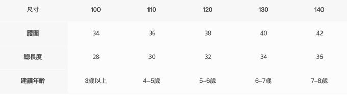 2. 平均尺寸表乃參考平均值制定,每位孩童成長速度略有不同,請參考孩子實際體型、現有衣物尺寸等實際測量結果進行選購。