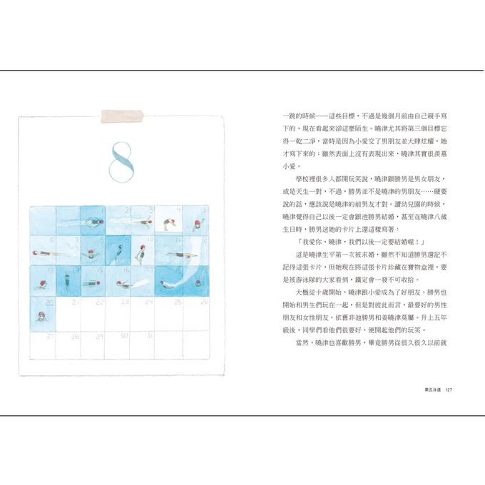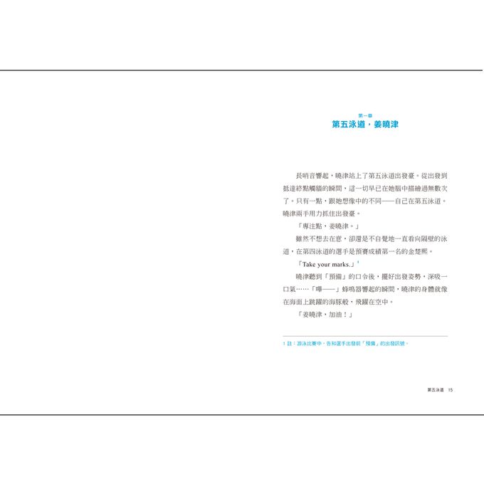 每一個運動員背後都有很多辛酸與血淚,因為要獨自承受所有的訓練,必須犧牲很多的欲望與時間,只為超越自己每一次的成績。透過小說故事介紹游泳這項運動,作者筆下的主角曉津為了自己熱愛的運動,一次次接受挫折與挑戰,雖然身心疲累,依然堅持著對於自己設定的目標,把運動員的日常描寫得完整又生動,包含訓練的過程、參與比賽前後的情緒起伏,還有面對失敗時種種的壓力與自我懷疑,真的讓人感同身受。