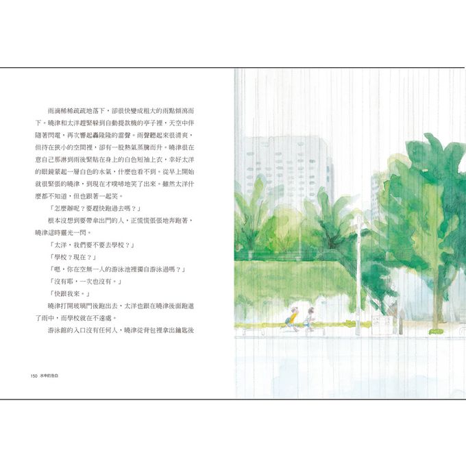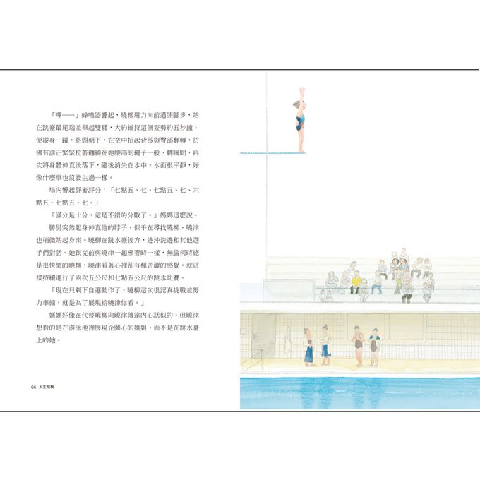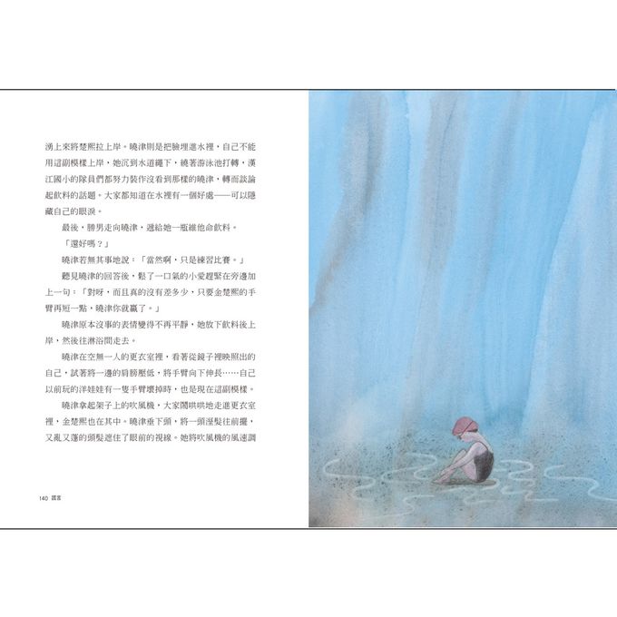 此外,本書的插圖也為這個故事更添吸引力。插圖由曾獲得布拉提斯拉瓦插畫雙年展(BIB)金蘋果獎的盧仁慶繪製。淡水彩描繪的圖畫,生動表現出親水運動的涼快與輕盈;插畫家傳神捕捉了孩子們競速時帥氣的泳姿、盛夏的晴空和綠意、水中告白浪漫的氣泡……當然最動人的是,雲影水色交疊的游池中,一個振臂前進的身影─女孩宛如展翅般飛向自己的天空。