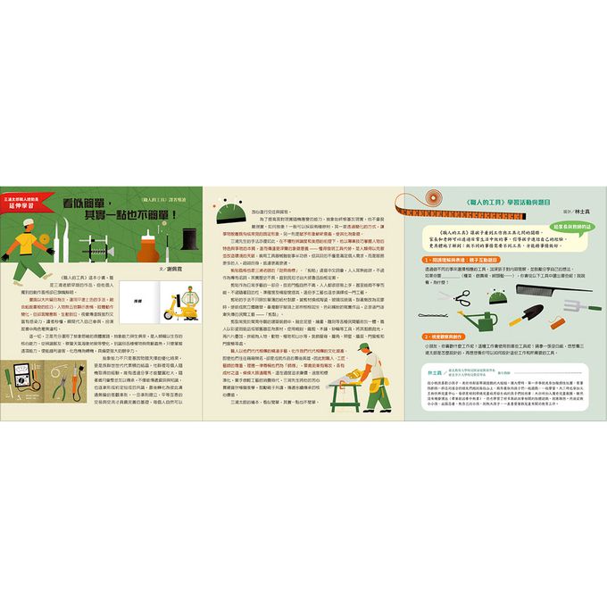 本套書特別收錄藝術評論人謝佩霓為兩書撰寫的導讀摺頁,開啟孩子對圖像與抽象概念的思考視野,並附上由幼教老師林士真設計的延伸學習單,透過觀察、分類與創作,讓閱讀觸發更多探索與實作的可能。透過這兩本書,孩子不僅能認識職人世界與數字概念,更能體會「工具如何改變世界」,讓學習變得更生動有趣!