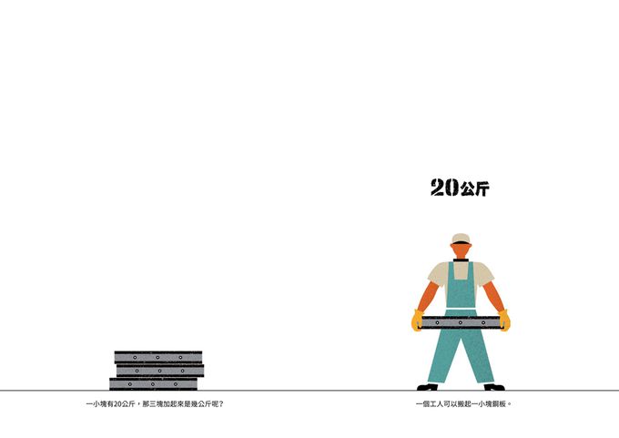書中結合重量單位與數量的概念,透過不同場景的搬運過程,幫助孩子在閱讀中自然而然地運用數學邏輯。例如,從「一個工人搬起一塊20公斤的鋼板」,到「一輛貨輪能載重1000公噸」,讓孩子理解數字、單位與搬運方式的關聯,在閱讀中培養數感與邏輯思考能力。