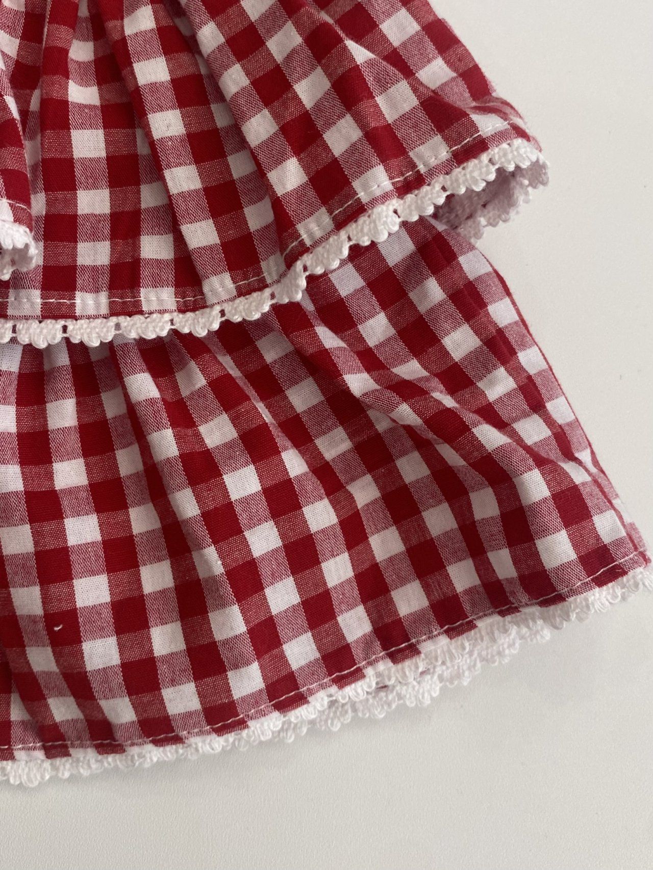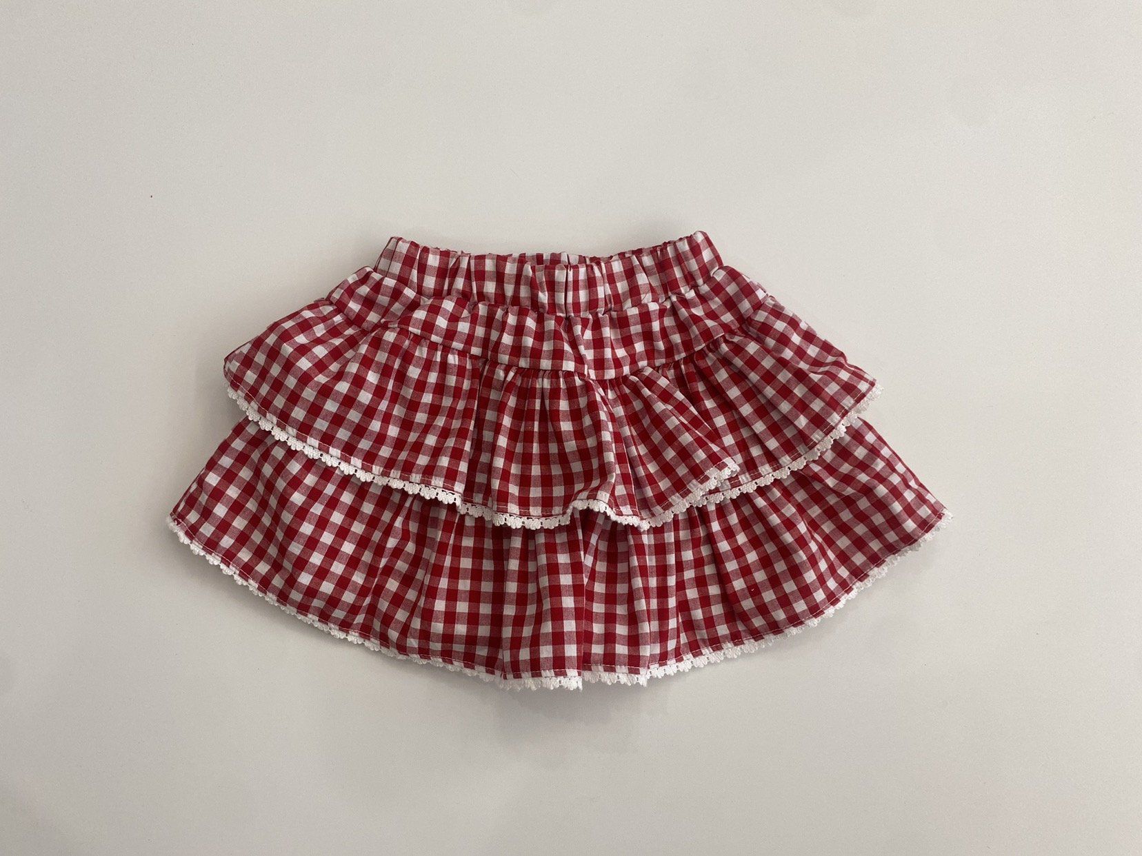 韓國 ERINJ - 鬆緊腰蕾絲鑲邊格紋蛋糕裙-紅