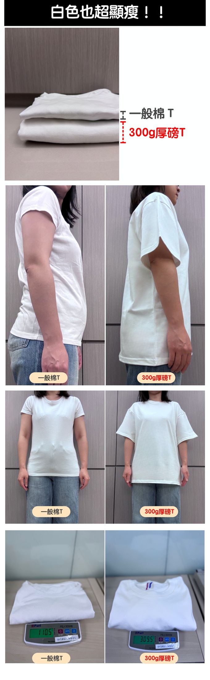 以下為300g厚磅純棉顯瘦3D剪裁短袖上衣/T恤的真實開箱比較。