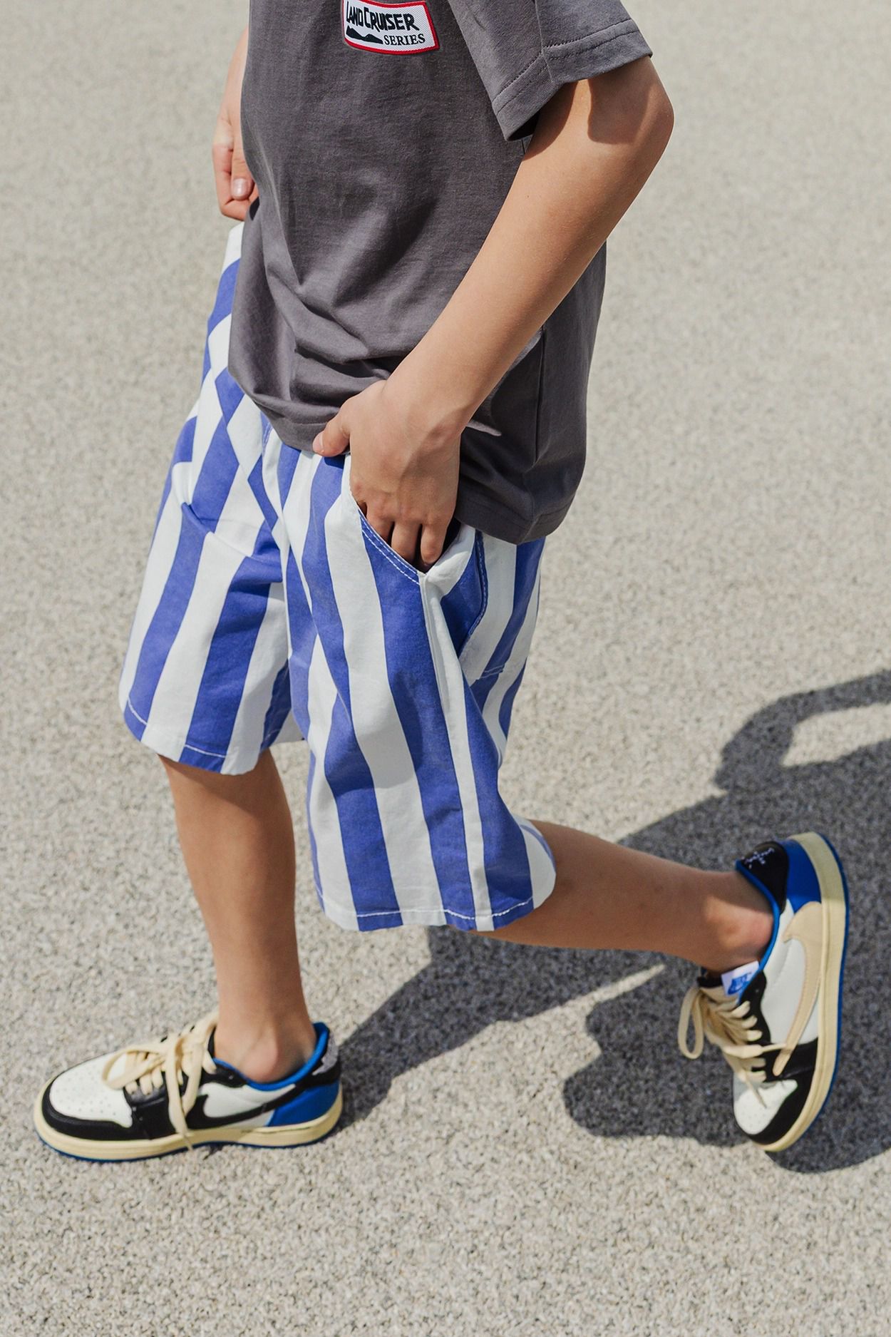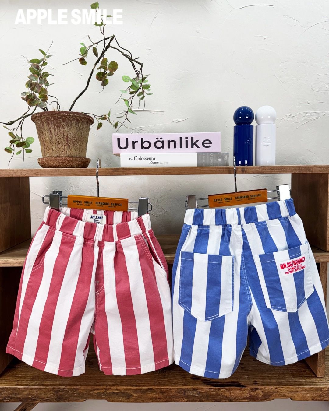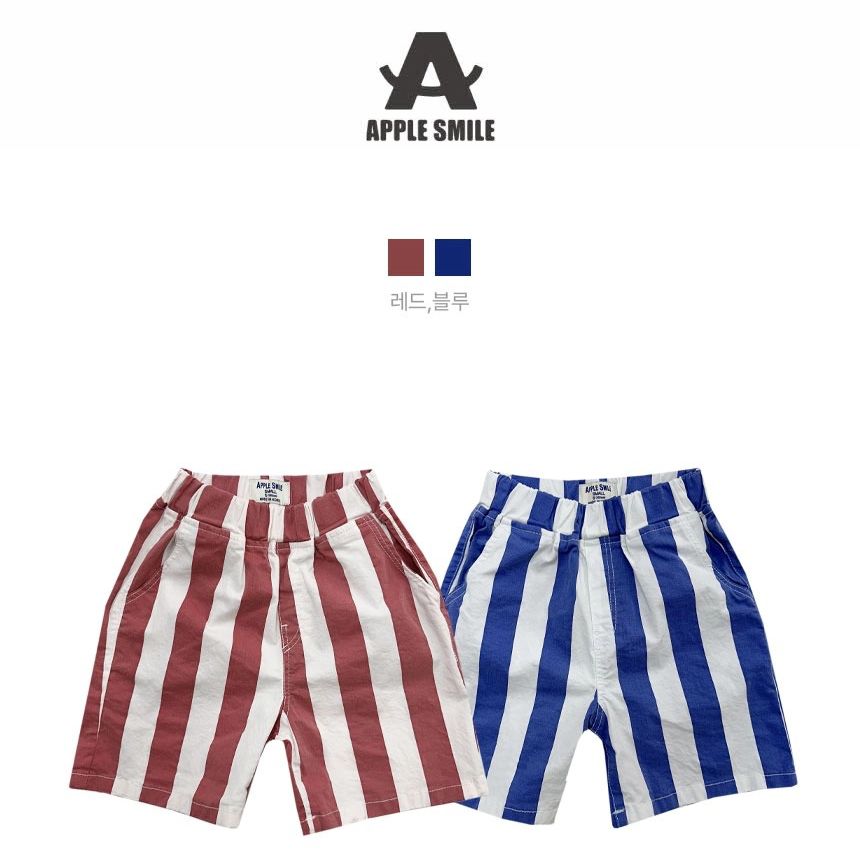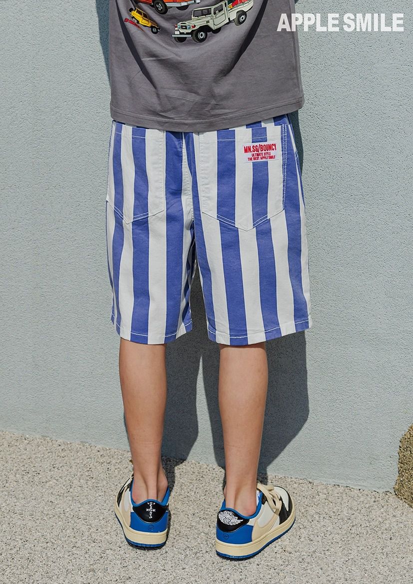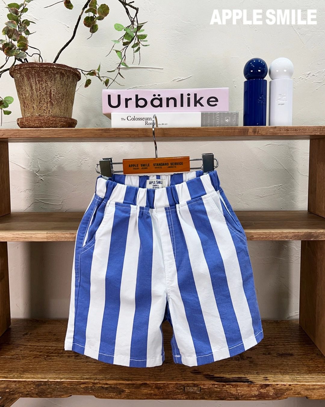 韓國 APPLE SMILE - 鬆緊腰大口袋寬直紋過膝褲-藍