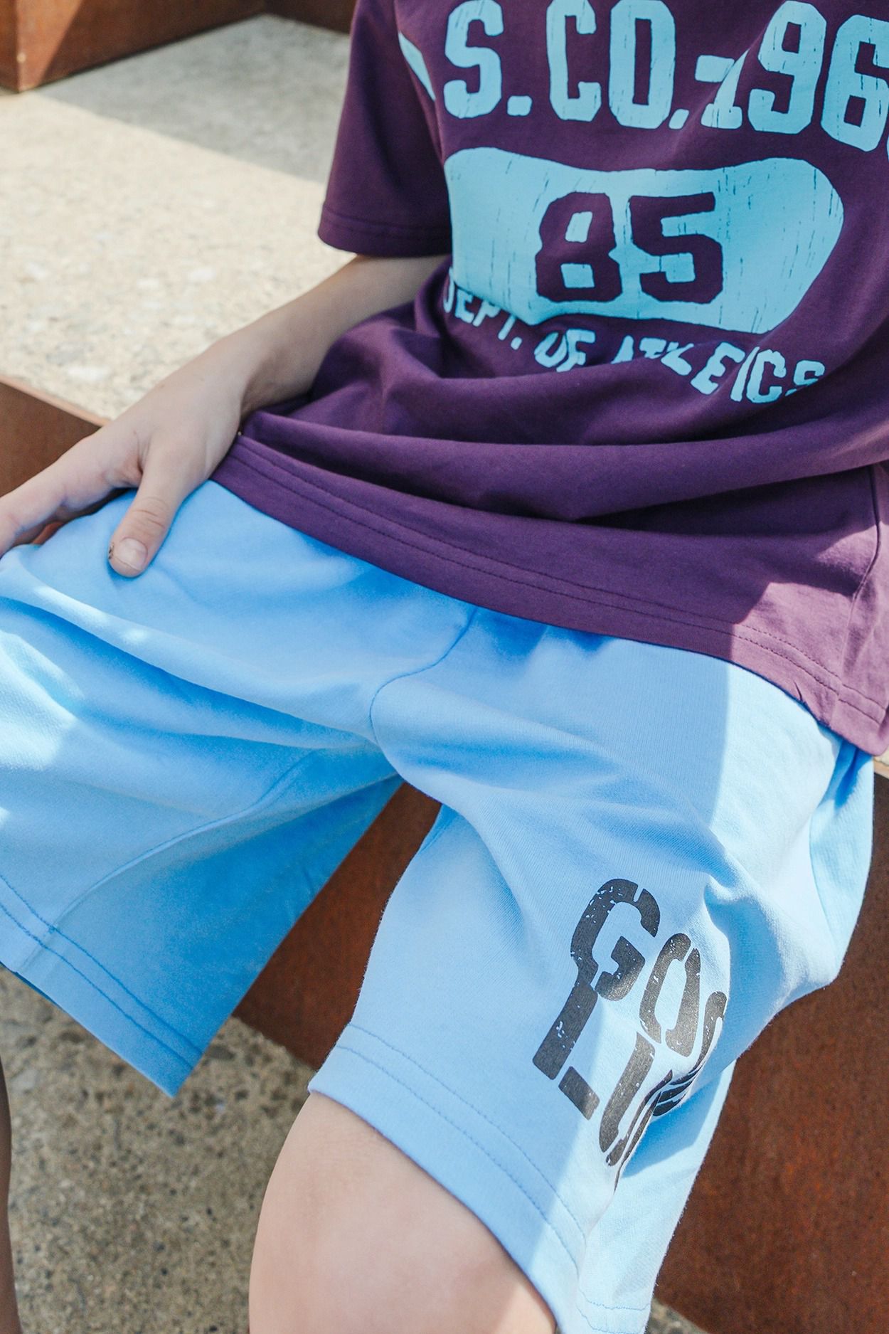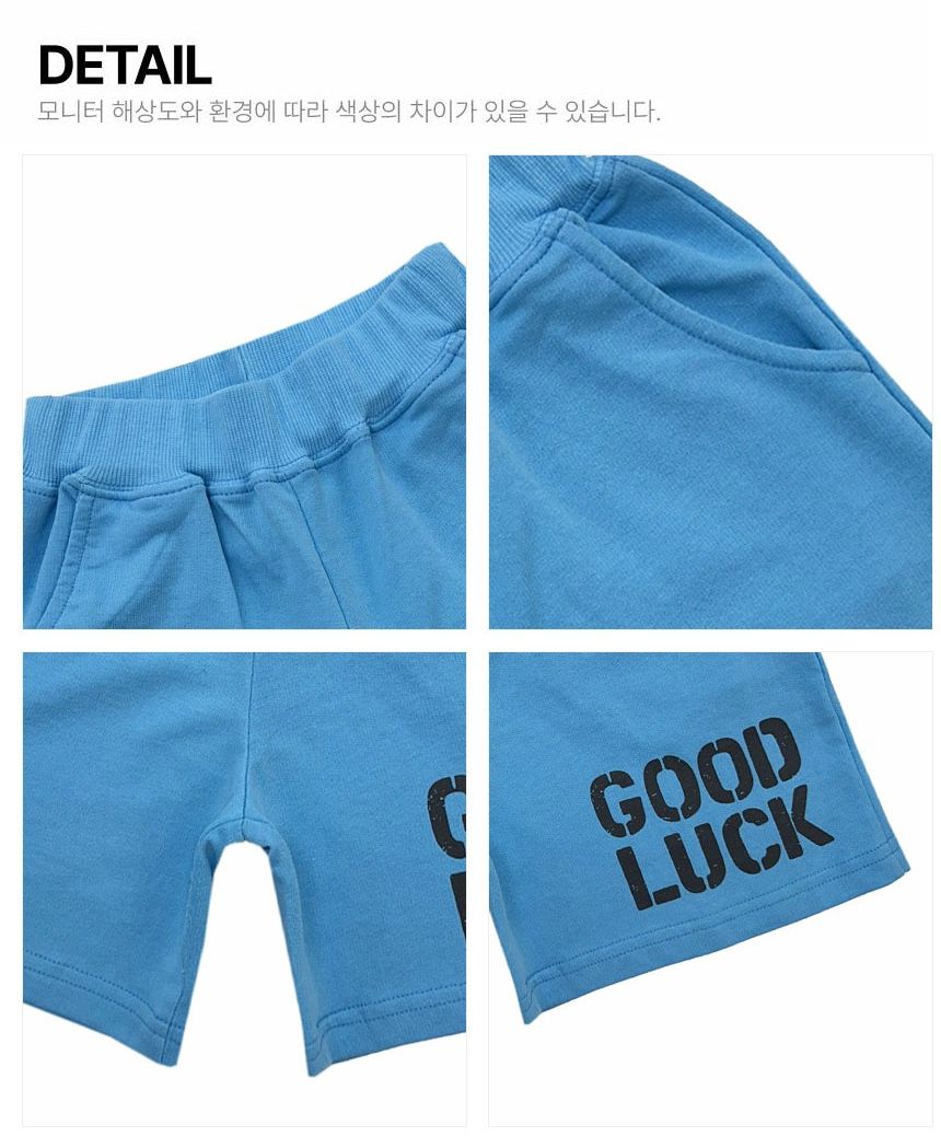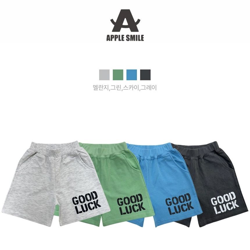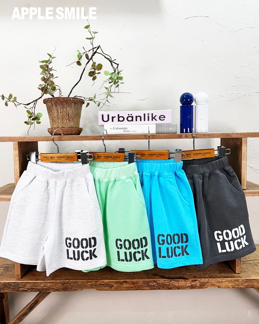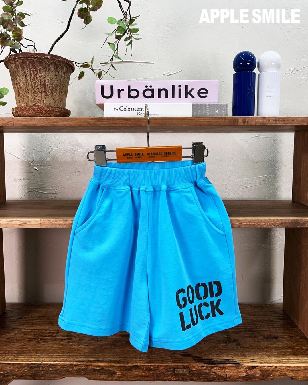 韓國 APPLE SMILE - 鬆緊腰GOOD LUCK過膝棉褲-水藍